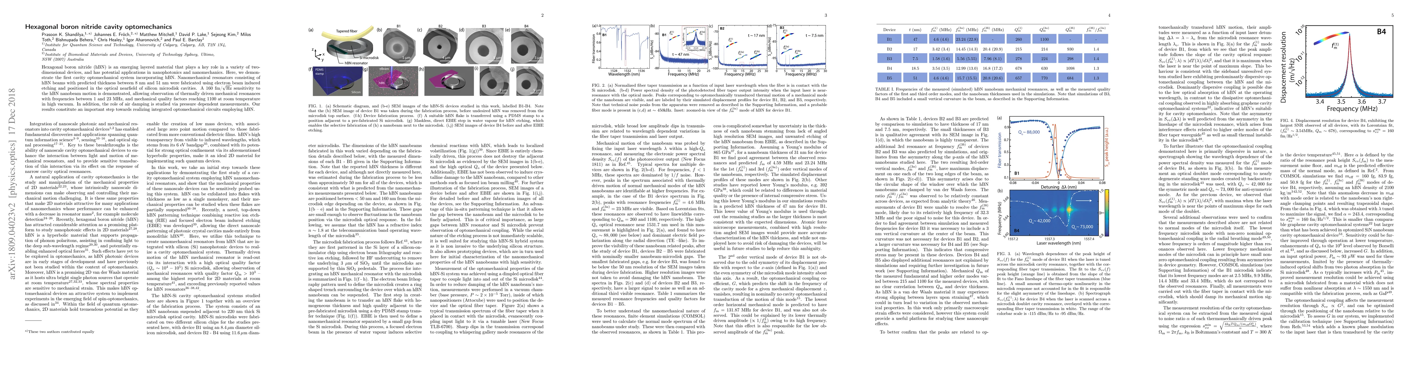 This paper demonstrates the first cavity optomechanical system using hexagonal boron nitride (hBN) nanomechanical resonators, achieving high sensitivity and quality factors for potential integration into nanophotonic devices. The study also investigates air damping effects through pressure-dependent measurements.