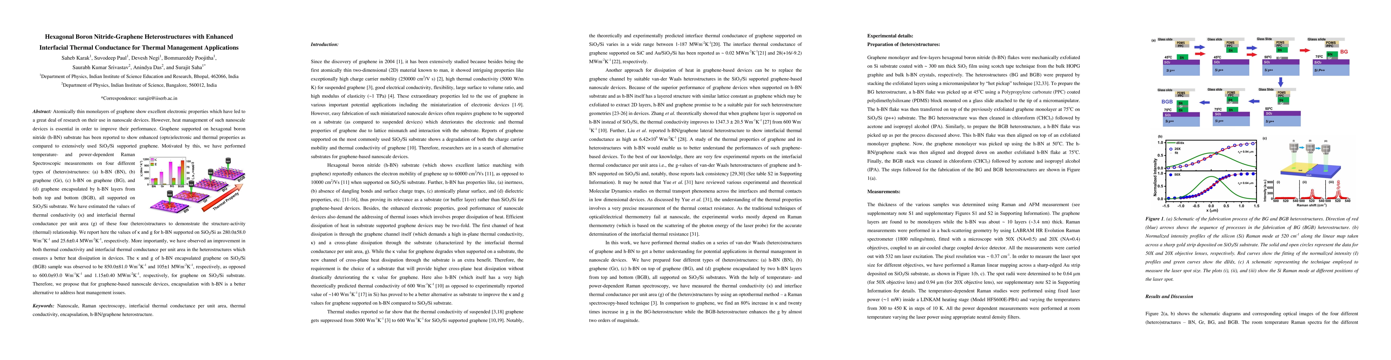 Atomically thin monolayers of graphene show excellent electronic properties which have led to a great deal of research on their use in nanoscale devices. However, heat management of such nanoscale devices is essential in order to improve their performance. Graphene supported on hexagonal boron nitride (h-BN) substrate has been reported to show enhanced (opto)electronic and thermal properties as compared to extensively used SiO2/Si supported graphene. Motivated by this, we have performed temperature- and power-dependent Raman Spectroscopic measurements on four different types of (hetero)structures: (a) h-BN (BN), (b) graphene (Gr), (c) h-BN on graphene (BG), and (d) graphene encapsulated by h-BN layers from both top and bottom (BGB), all supported on SiO2/Si substrate. We have estimated the values of thermal conductivity (\k{appa}) and interfacial thermal conductance per unit area (g) of these four (hetero)structures to demonstrate the structure-activity (thermal) relationship. We report here the values of \k{appa} and g for h-BN supported on SiO2/Si as 280.0 +-58.0 Wm-1K-1 and 25.6+-0.4 MWm-2K-1, respectively. More importantly, we have observed an improvement in both thermal conductivity and interfacial thermal conductance per unit area in the heterostructures which ensures a better heat dissipation in devices. The \k{appa} and g of h-BN encapsulated graphene on SiO2/Si (BGB) sample was observed to be 850.0+-81.0 Wm-1K-1 and 105+-1 MWm-2K-1, respectively, as opposed to 600.0+-93.0 Wm-1K-1 and 1.15+-0.40 MWm-2K-1, respectively, for graphene on SiO2/Si substrate. Therefore, we propose that for graphene-based nanoscale devices, encapsulation with h-BN is a better alternative to address heat management issues.