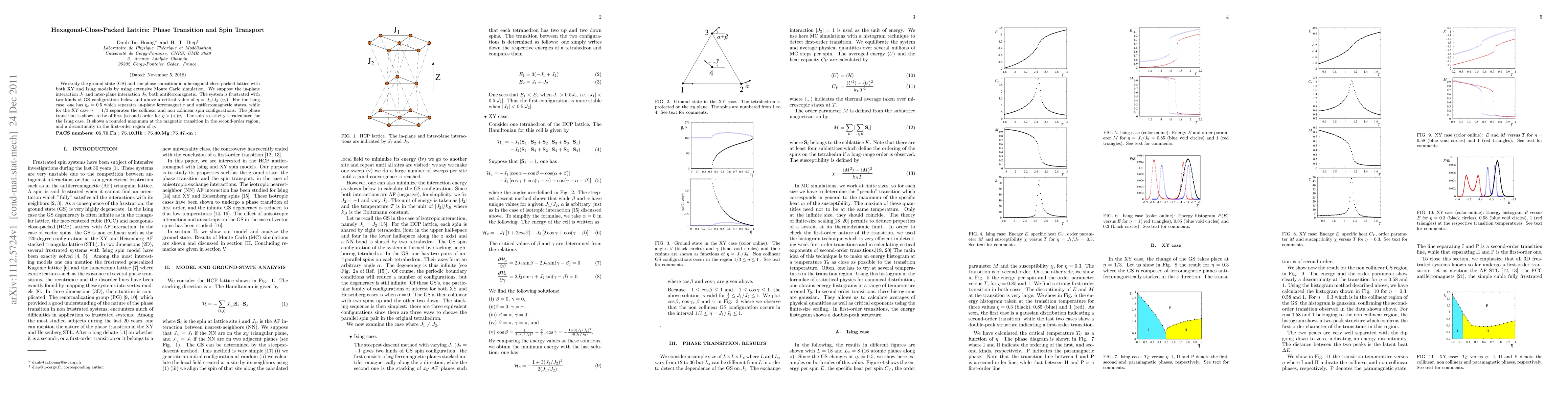 This paper explores the phase transition in a hexagonal-close-packed lattice using Monte Carlo simulations for both XY and Ising models, identifying critical interaction ratios that lead to distinct ground states and first/second-order transitions. Spin resistivity in the Ising case exhibits a rounded maximum at the second-order transition and a discontinuity at the first-order transition.