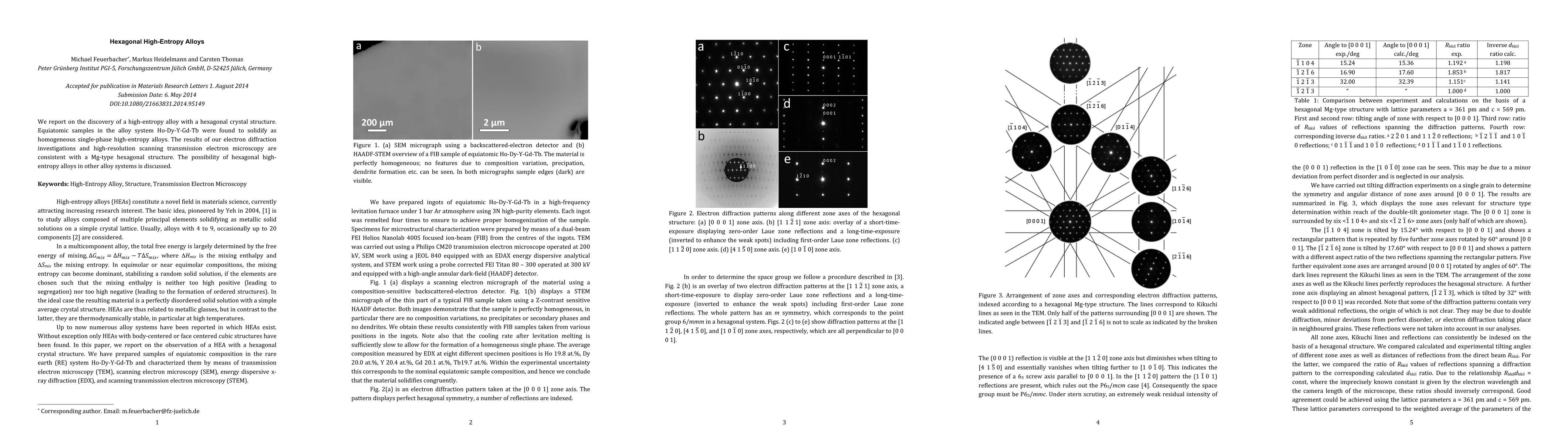 This paper reports the discovery of a high-entropy alloy with a hexagonal crystal structure in the Ho-Dy-Y-Gd-Tb system, confirmed by electron diffraction and microscopy, suggesting potential for similar alloys in other systems.