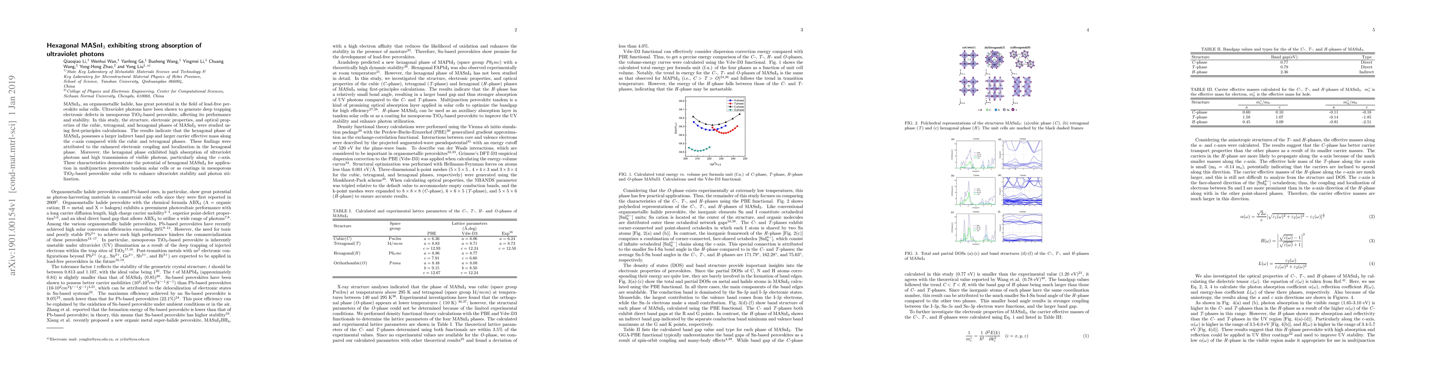MASnI$_3$, an organometallic halide, has great potential in the field of lead-free perovskite solar cells. Ultraviolet photons have been shown to generate deep trapping electronic defects in mesoporous TiO$_2$-based perovskite, affecting its performance and stability. In this study, the structure, electronic properties, and optical properties of the cubic, tetragonal, and hexagonal phases of MASnI$_3$ were studied using first-principles calculations. The results indicate that the hexagonal phase of MASnI$_3$ possesses a larger indirect band gap and larger carrier effective mass along the \emph{c}-axis compared with the cubic and tetragonal phases. These findings were attributed to the enhanced electronic coupling and localization in the hexagonal phase. Moreover, the hexagonal phase exhibited high absorption of ultraviolet photons and high transmission of visible photons, particularly along the \emph{c}-axis. These characteristics demonstrate the potential of hexagonal MASnI$_3$ for application in multijunction perovskite tandem solar cells or as coatings in mesoporous TiO$_2$-based perovskite solar cells to enhance ultraviolet stability and photon utilization.