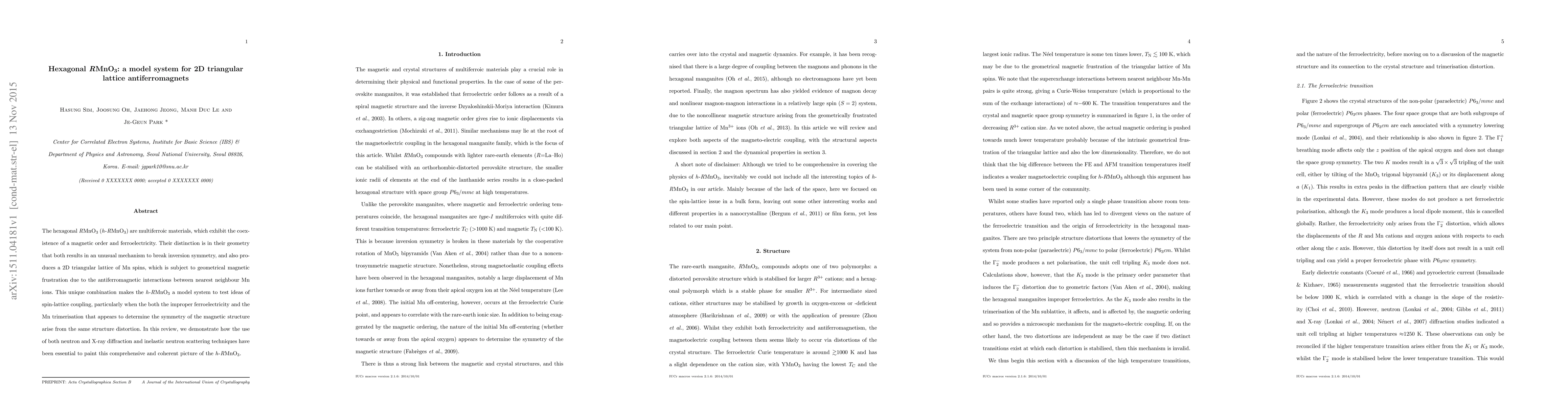This paper reviews hexagonal RMnO$_3$ materials as model systems for 2D triangular lattice antiferromagnets, highlighting their unique magnetic and ferroelectric properties due to geometric frustration and spin-lattice coupling. The study emphasizes the use of neutron and X-ray diffraction to elucidate the magnetic structure and interactions.