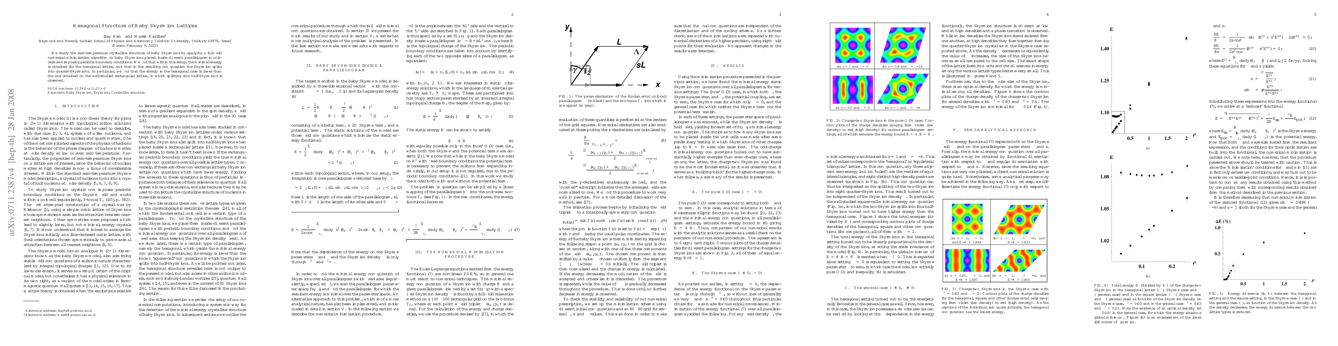 We study the zero-temperature crystalline structure of baby Skyrmions by applying a full-field numerical minimization algorithm to baby Skyrmions placed inside different parallelogramic unit-cells and imposing periodic boundary conditions. We find that within this setup, the minimal energy is obtained for the hexagonal lattice, and that in the resulting configuration the Skyrmion splits into quarter-Skyrmions. In particular, we find that the energy in the hexagonal case is lower than the one obtained on the well-studied rectangular lattice, in which splitting into half-Skyrmions is observed.