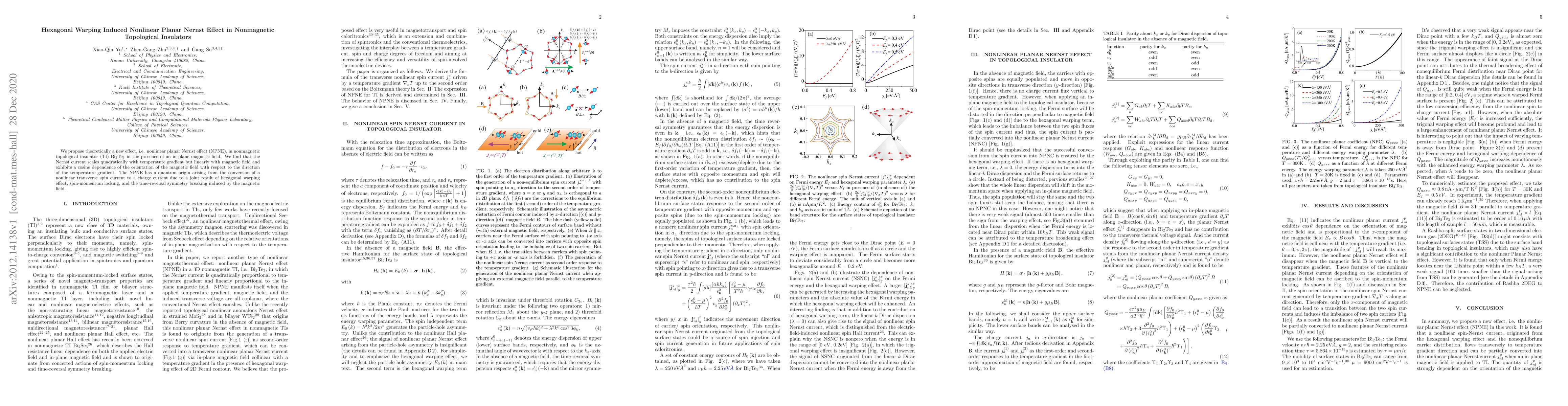 This paper theoretically proposes a nonlinear planar Nernst effect (NPNE) in nonmagnetic topological insulator Bi2Te3, where the Nernst current scales quadratically with temperature gradient and linearly with magnetic field, exhibiting a cosine dependence on the magnetic field orientation. The NPNE's quantum origin arises from hexagonal warping, spin-momentum locking, and symmetry breaking due to the magnetic field.