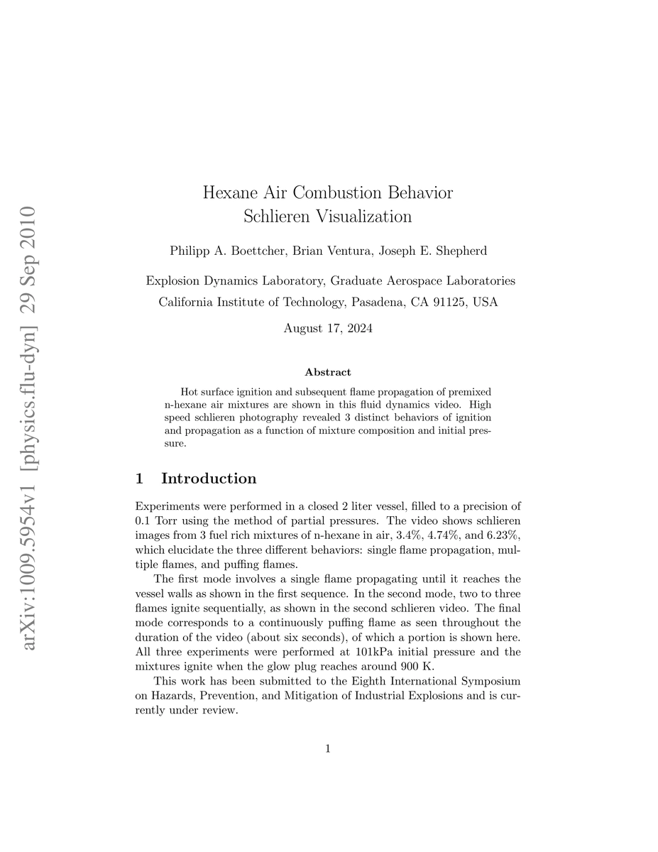 This work is novel in its use of high-speed schlieren photography to elucidate the complex behavior of premixed n-hexane air mixtures during hot surface ignition.