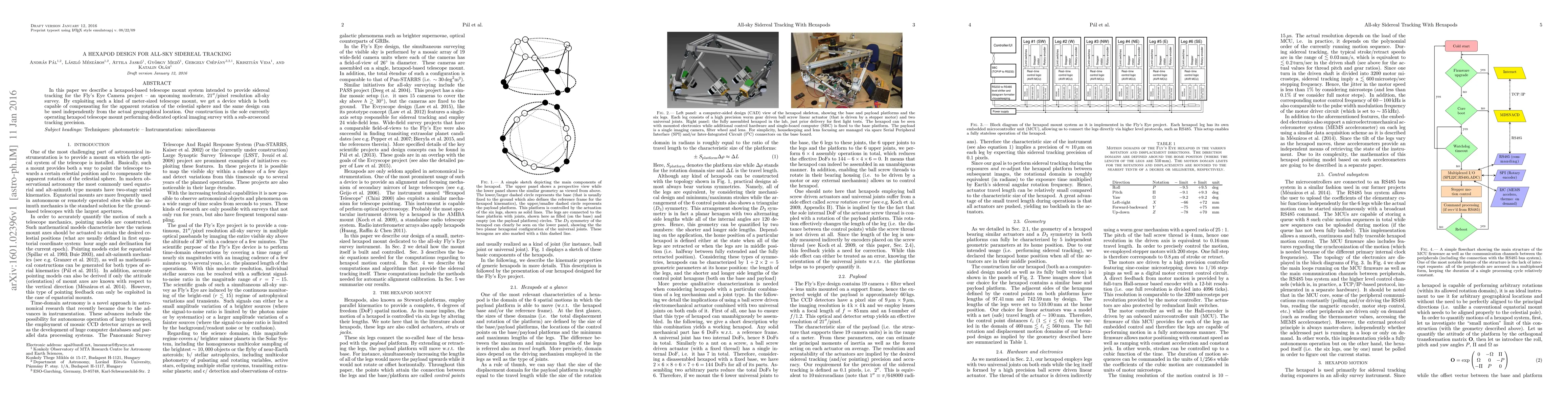 In this paper we describe a hexapod-based telescope mount system intended to provide sidereal tracking for the Fly's Eye Camera project -- an upcoming moderate, 21"/pixel resolution all-sky survey. By exploiting such a kind of meter-sized telescope mount, we get a device which is both capable of compensating for the apparent rotation of the celestial sphere and the same design can be used independently from the actual geographical location. Our construction is the sole currently operating hexapod telescope mount performing dedicated optical imaging survey with a sub-arcsecond tracking precision.