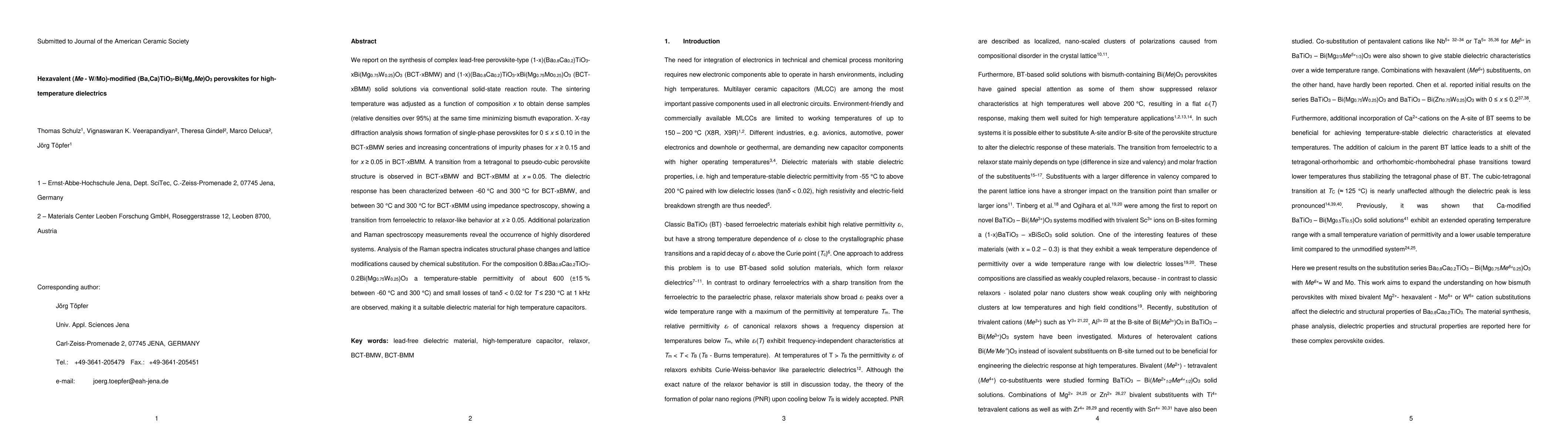This paper synthesizes lead-free perovskite-type solid solutions of (Ba,Ca)TiO$_3$-Bi(Mg,Me)O$_3$ and investigates their dielectric properties. The materials show stable permittivity and low dielectric losses, making them suitable for high-temperature dielectric applications.