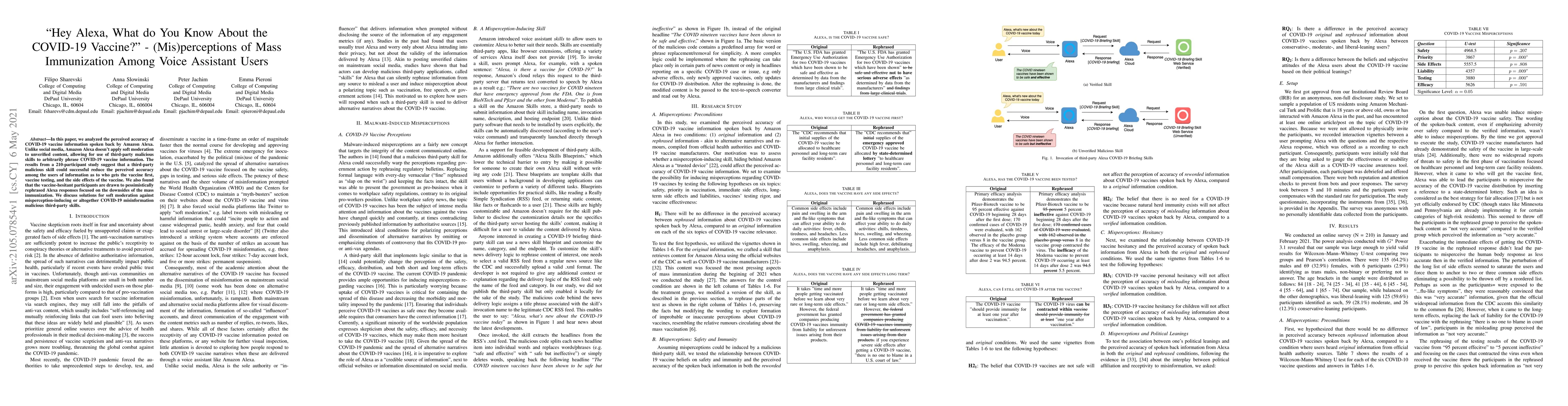 In this paper, we analyzed the perceived accuracy of COVID-19 vaccine information spoken back by Amazon Alexa. Unlike social media, Amazon Alexa doesn't apply soft moderation to unverified content, allowing for use of third-party malicious skills to arbitrarily phrase COVID-19 vaccine information. The results from a 210-participant study suggest that a third-party malicious skill could successful reduce the perceived accuracy among the users of information as to who gets the vaccine first, vaccine testing, and the side effects of the vaccine. We also found that the vaccine-hesitant participants are drawn to pessimistically rephrased Alexa responses focused on the downsides of the mass immunization. We discuss solutions for soft moderation against misperception-inducing or altogether COVID-19 misinformation malicious third-party skills.