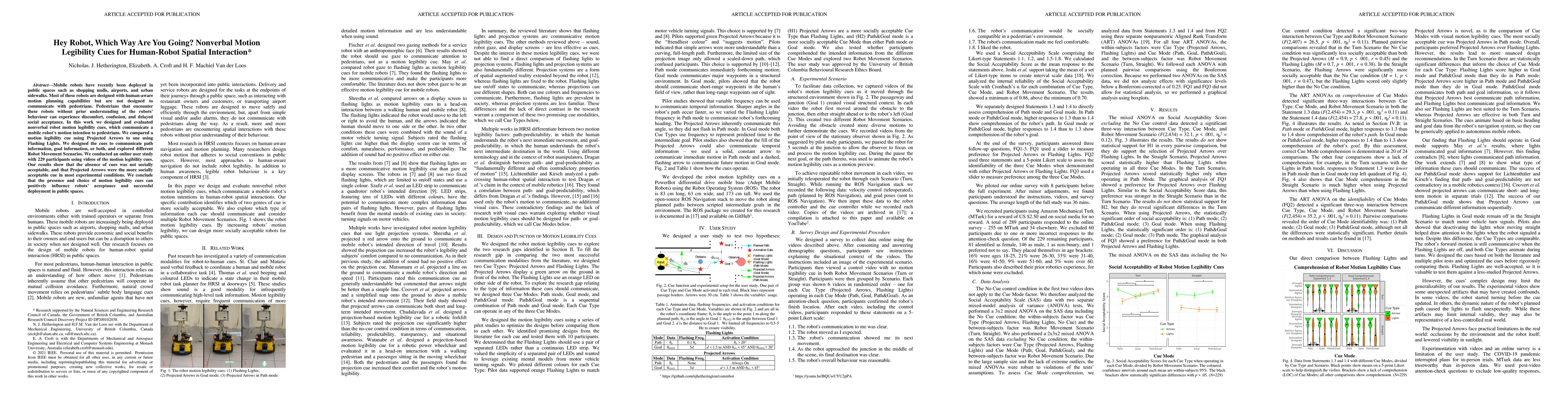 This study investigates nonverbal motion legibility cues to enhance human-robot interaction in public spaces. It compares Projected Arrows and Flashing Lights to communicate a robot's path and goal intentions, finding that Projected Arrows are more socially acceptable, thus improving robot acceptance and deployment.