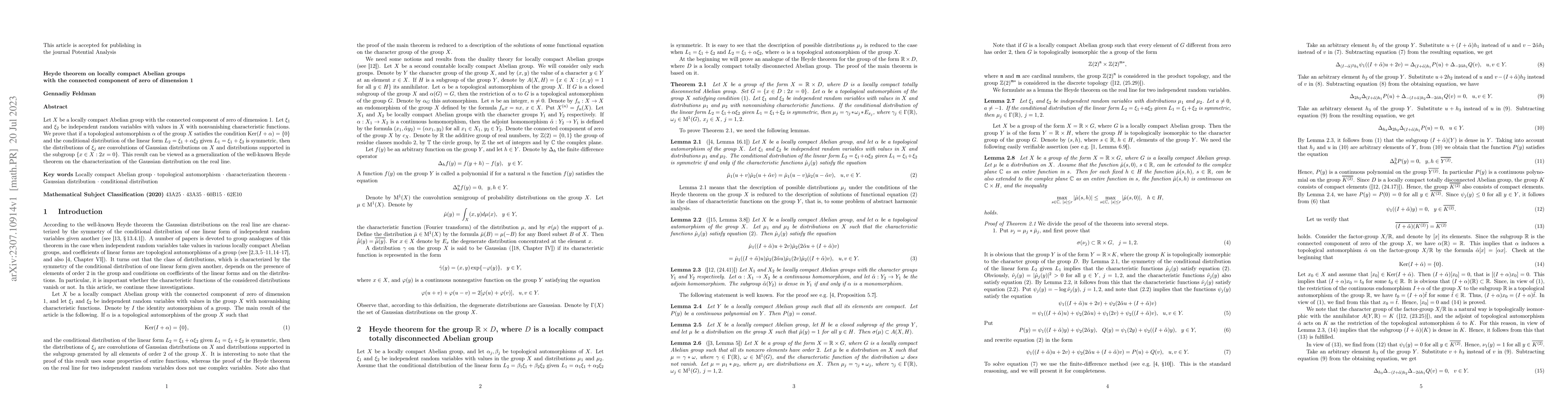 Let $X$ be a locally compact Abelian group with the connected component of zero of dimension 1. Let $\xi_1$ and $\xi_2$ be independent random variables with values in $X$ with nonvanishing characteristic functions. We prove that if a topological automorphism $\alpha$ of the group $X$ satisfies the condition ${{\rm Ker}(I+\alpha)=\{0\}}$ and the conditional distribution of the linear form ${L_2 = \xi_1 + \alpha\xi_2}$ given ${L_1 = \xi_1 + \xi_2}$ is symmetric, then the distributions of $\xi_j$ are convolutions of Gaussian distributions on $X$ and distributions supported in the subgroup $\{x\in X:2x=0\}$. This result can be viewed as a generalization of the well-known Heyde theorem on the characterization of the Gaussian distribution on the real line.