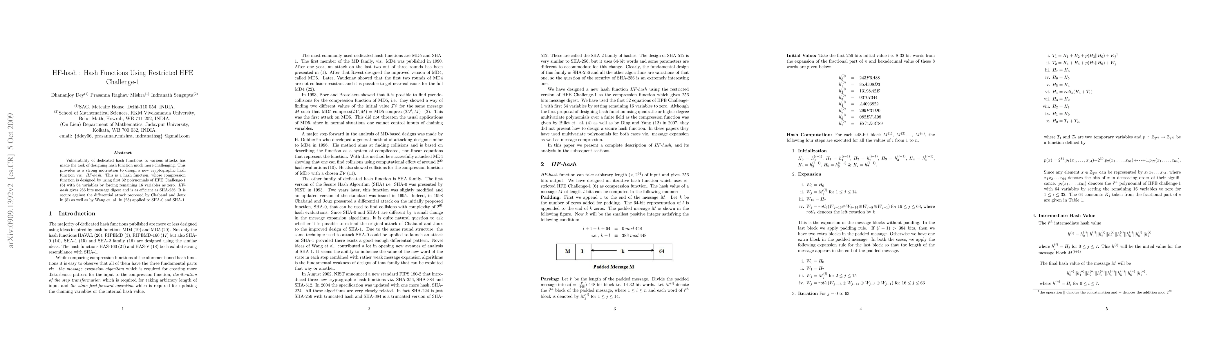 HF-hash is a new cryptographic hash function utilizing the first 32 polynomials from HFE Challenge-1, offering a 256-bit message digest and efficient performance comparable to SHA-256, while being secure against differential attacks previously used against SHA-0 and SHA-1.