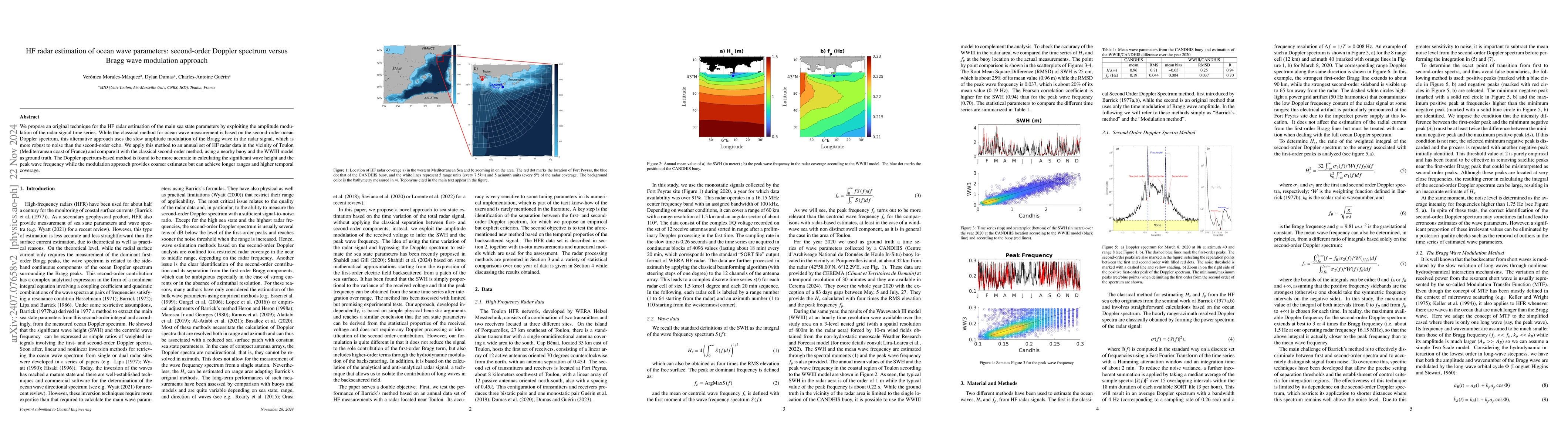 This research proposes a novel HF radar technique for estimating ocean wave parameters using the amplitude modulation of the radar signal, contrasting with the classical second-order Doppler spectrum method. While the Doppler method is more precise for significant wave height and peak frequency, the modulation approach offers better robustness to noise and extended range and temporal coverage.