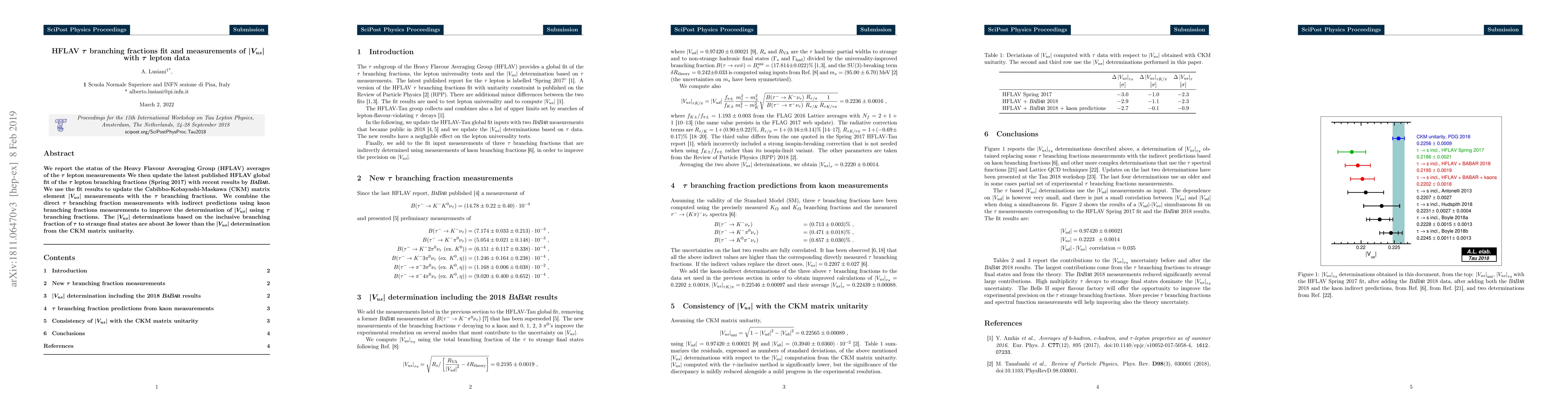This paper updates the Heavy Flavour Averaging Group's (HFLAV) fit of $\tau$ lepton branching fractions with recent BABAR results, and uses these to refine the Vus CKM matrix element. The Vus determination from $\tau$ branching fractions is found to be $3\sigma$ lower than that from CKM matrix unitarity.