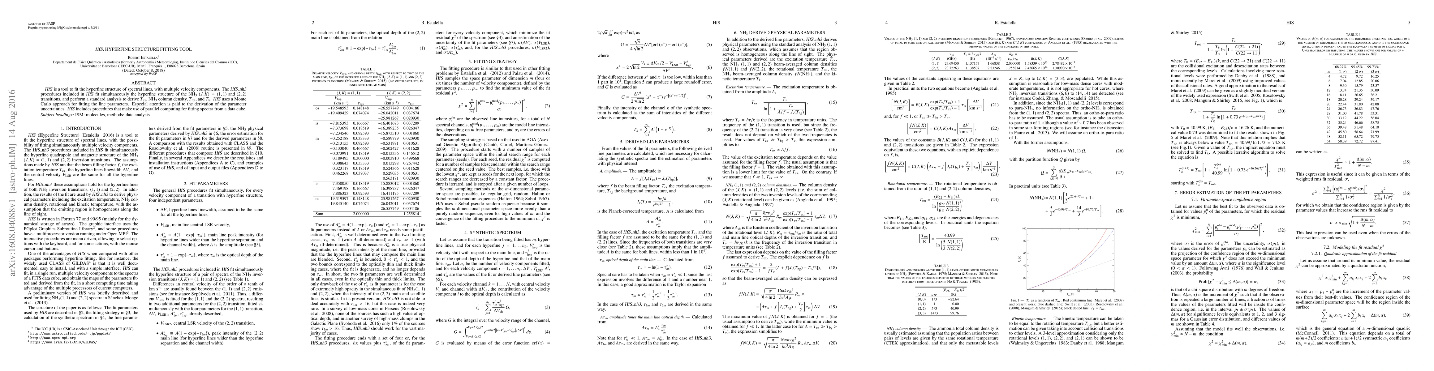 HfS is a tool designed to fit the hyperfine structure of spectral lines, particularly for NH$_3$ transitions, using a Monte Carlo approach and parallel computing to enhance efficiency. The software derives parameters such as $T_\mathrm{ex}$, NH$_3$ column density, $T_\mathrm{rot}$, and $T_\mathrm{k}$ with careful attention to parameter uncertainties.