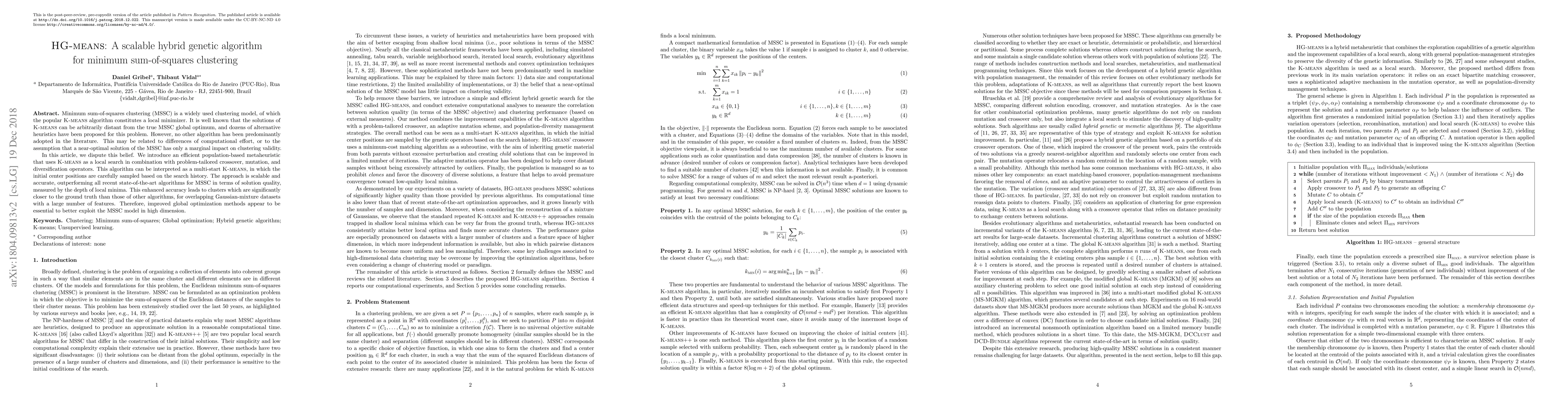 This paper introduces HG-means, a scalable hybrid genetic algorithm for minimum sum-of-squares clustering, which combines K-means with tailored crossover, mutation, and diversification to achieve superior clustering accuracy. The algorithm outperforms recent state-of-the-art methods, demonstrating that enhanced global optimization is crucial for better high-dimensional clustering.