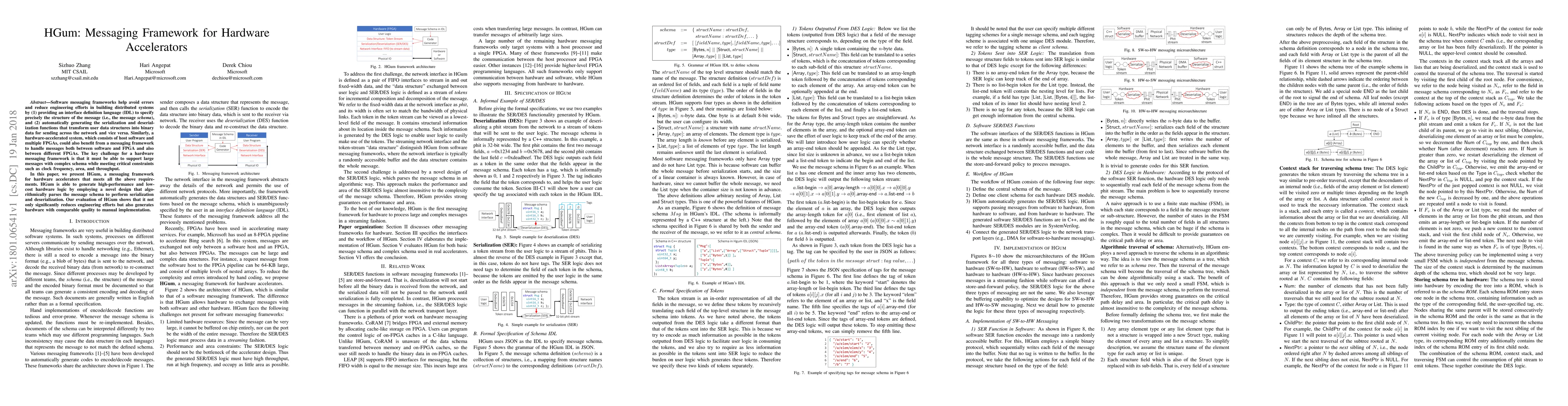 HGum is a messaging framework designed to efficiently handle communication in hardware-accelerated systems, reducing engineering efforts and generating high-performance and low-cost hardware logic. It achieves this by parsing message schemas algorithmically for serialization and deserialization, meeting critical constraints like clock frequency, area, and throughput.