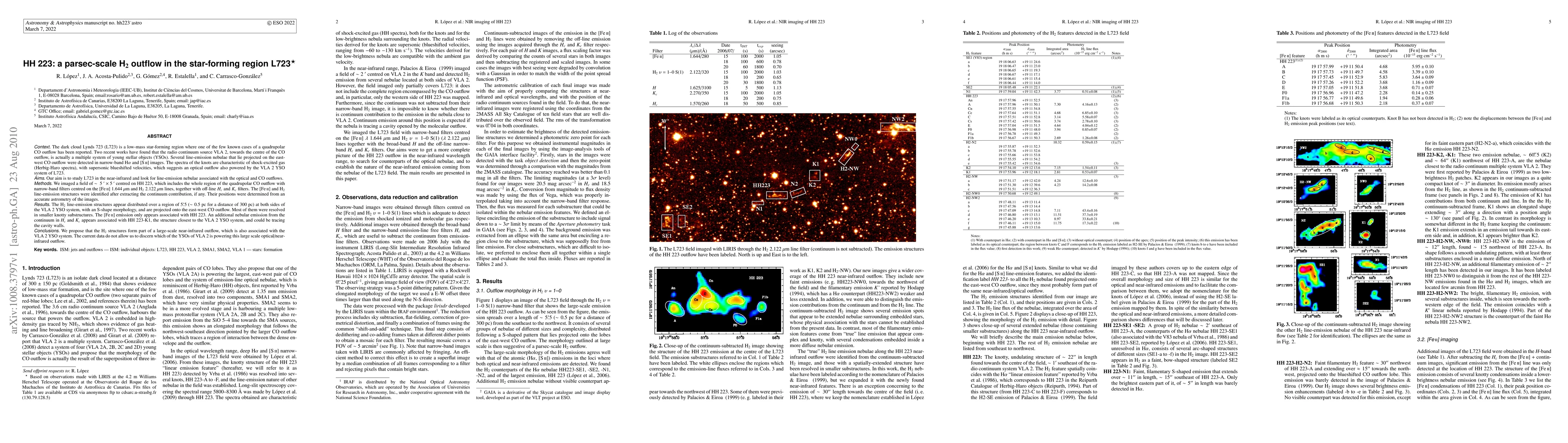 The dark cloud Lynds 723 (L723) is a low-mass star-forming region where one of the few known cases of a quadrupolar CO outflow has been reported. Two recent works have found that the radio continuum source VLA 2, towards the centre of the CO outflow, is actually a multiple system of young stellar objects (YSOs). Several line-emission nebulae that lie projected on the east-west CO outflow were detected in narrow-band Halpha and [SII] images. The spectra of the knots are characteristic of shock-excited gas (Herbig-Haro spectra), with supersonic blueshifted velocities, which suggests an optical outflow also powered by the VLA 2 YSO system of L723. We imaged a field of ~5' X 5' centred on HH 223, which includes the whole region of the quadrupolar CO outflow with nir narrow-band filters . The H2 line-emission structures appear distributed over a region of 5.5' (0.5 pc for a distance of 300 pc) at both sides of the VLA 2 YSO system, with an S-shape morphology, and are projected onto the east-west CO outflow. Most of them were resolved in smaller knotty substructures. The [FeII] emission only appears associated with HH 223. An additional nebular emission from the continuum in Hc and Kc appears associated with HH 223-K1, the structure closest to the VLA 2 YSO system, and could be tracing the cavity walls. We propose that the H2 structures form part of a large-scale near-infrared outflow, which is also associated with the VLA 2 YSO system. The current data do not allow us to discern which of the YSOs of VLA 2 is powering this large scale optical/near-infrared outflow.