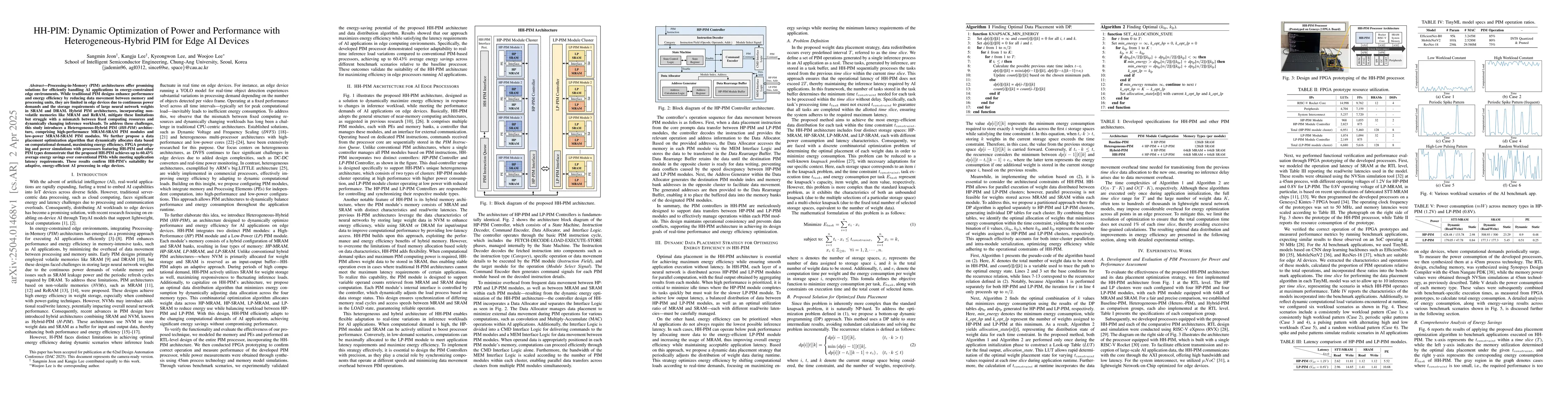 This paper proposes a Heterogeneous-Hybrid PIM (HH-PIM) architecture for edge AI devices, combining high-performance and low-power PIM modules to optimize power and performance. The dynamic optimization algorithm achieves up to 60.43% energy savings compared to conventional PIMs, demonstrating its effectiveness for energy-efficient AI processing.