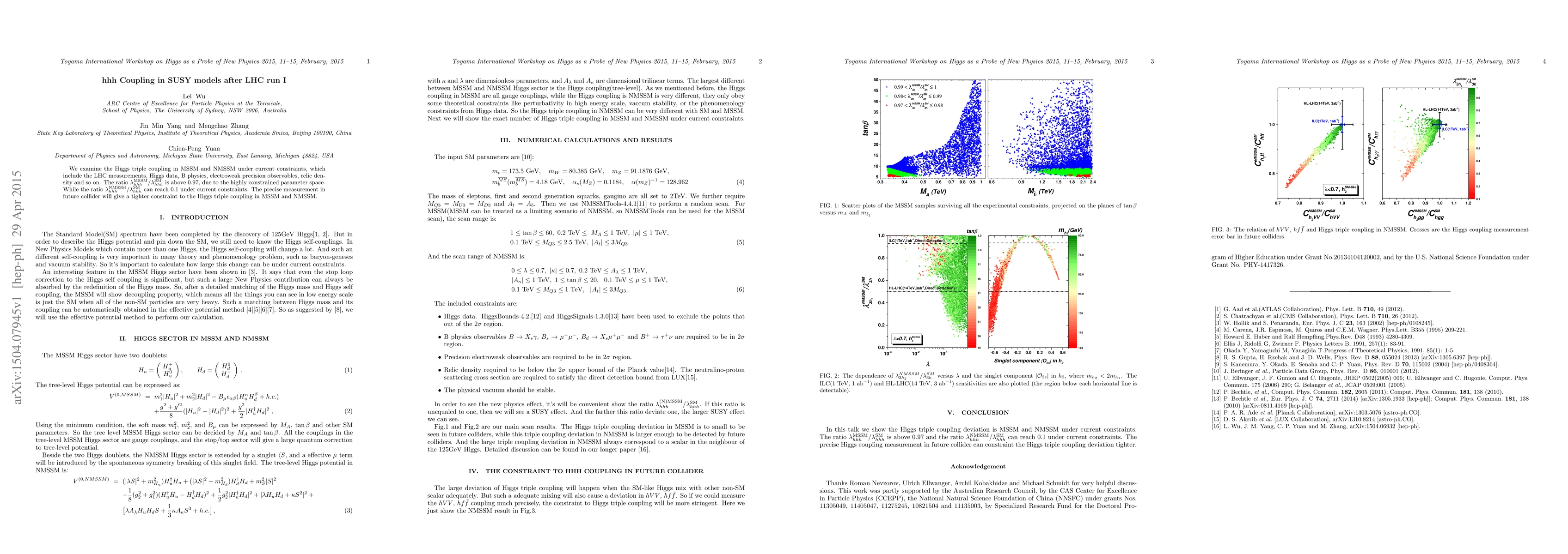 We examine the Higgs triple coupling in MSSM and NMSSM under current constraints, which include the LHC measurements, Higgs data, B physics, electroweak precision observables, relic density and so on. The ratio $\lambda^{\rm MSSM}_{hhh}/\lambda^{\rm SM}_{hhh}$ is above 0.97, due to the highly constrained parameter space. While the ratio $\lambda^{\rm NMSSM}_{hhh}/\lambda^{\rm SM}_{hhh}$ can reach 0.1 under current constraints. The precise measurement in future collider will give a tighter constraint to the Higgs triple coupling in MSSM and NMSSM.