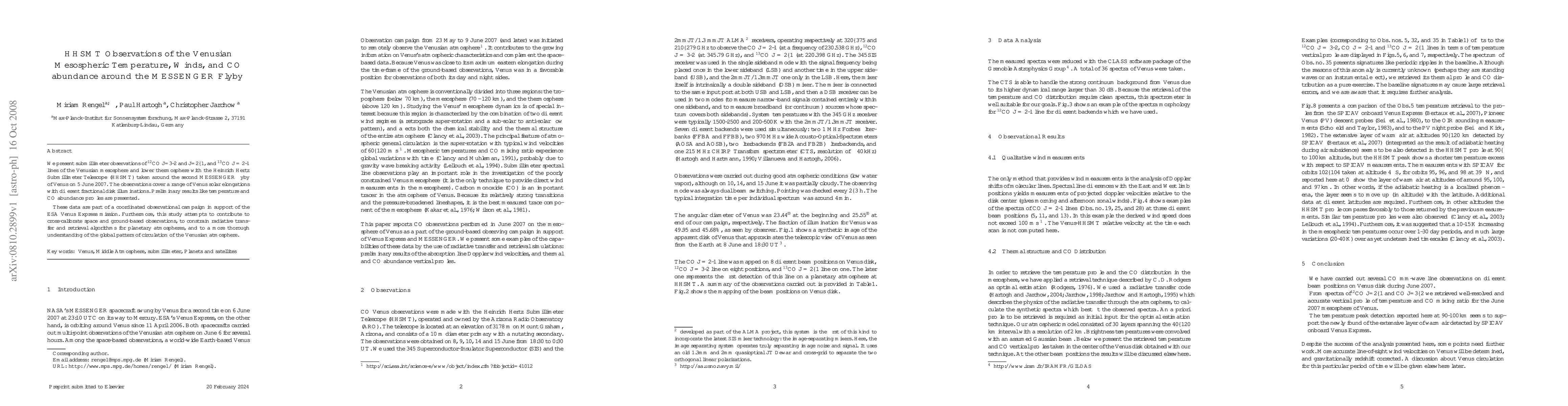 This study uses the HHSMT to observe Venusian mesosphere and lower thermosphere CO lines around the MESSENGER flyby, providing preliminary temperature and CO abundance profiles. The data aim to support the ESA Venus Express mission and improve understanding of Venusian atmospheric circulation.