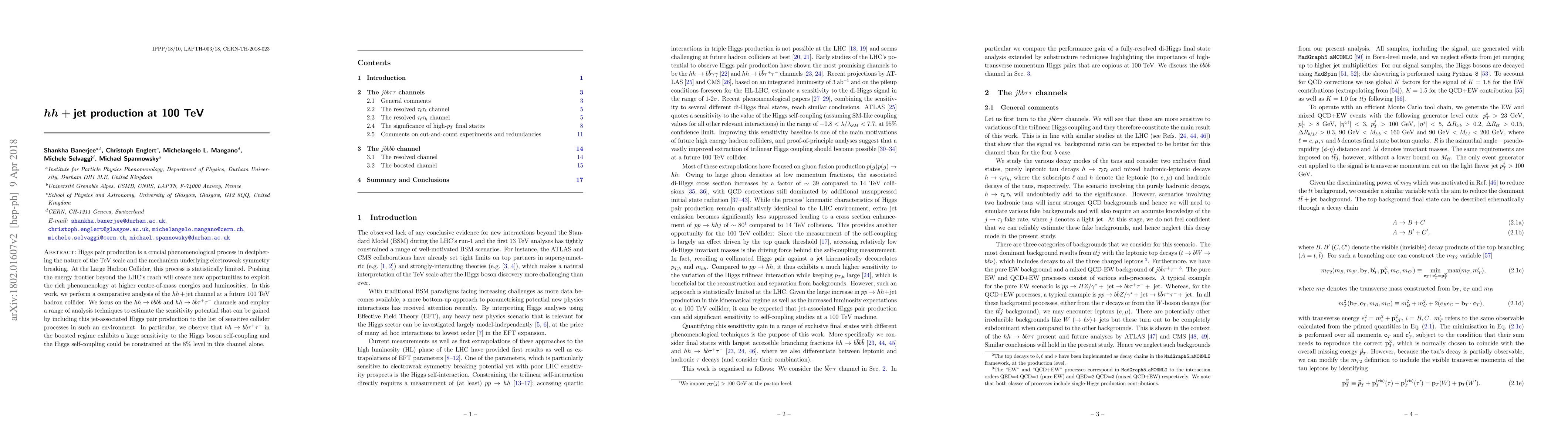 Higgs pair production is a crucial phenomenological process in deciphering the nature of the TeV scale and the mechanism underlying electroweak symmetry breaking. At the Large Hadron Collider, this process is statistically limited. Pushing the energy frontier beyond the LHC's reach will create new opportunities to exploit the rich phenomenology at higher centre-of-mass energies and luminosities. In this work, we perform a comparative analysis of the $hh+\text{jet}$ channel at a future 100 TeV hadron collider. We focus on the $hh\to b\bar b b\bar b$ and $hh \to b\bar b \tau^+\tau^-$ channels and employ a range of analysis techniques to estimate the sensitivity potential that can be gained by including this jet-associated Higgs pair production to the list of sensitive collider processes in such an environment. In particular, we observe that $hh \to b\bar b \tau^+\tau^-$ in the boosted regime exhibits a large sensitivity to the Higgs boson self-coupling and the Higgs self-coupling could be constrained at the 8\% level in this channel alone.