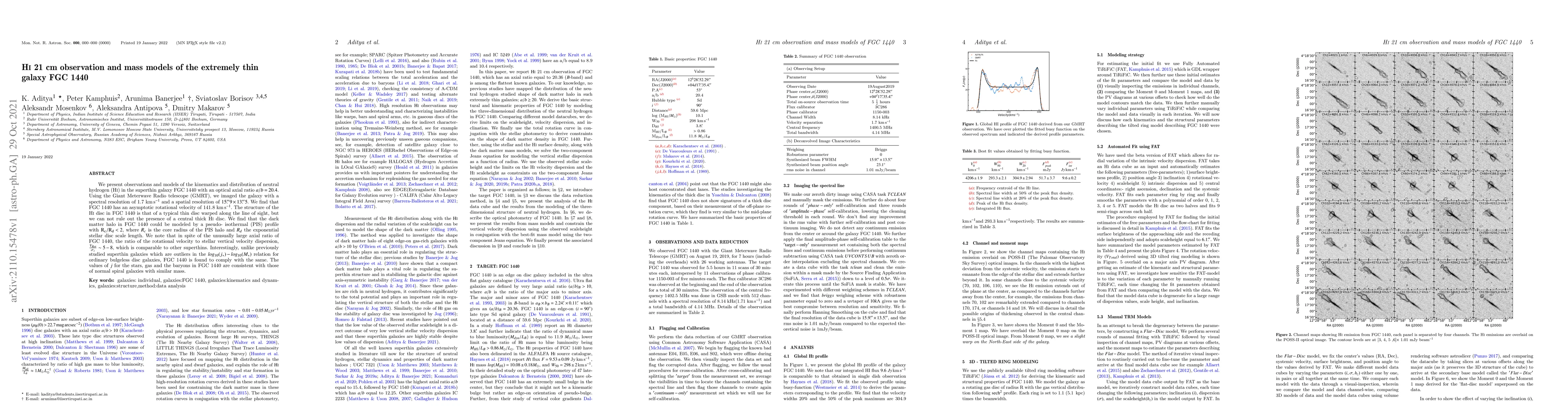 We present observations and models of the kinematics and distribution of neutral hydrogen (HI) in the superthin galaxy FGC 1440 with an optical axial ratio $a/b = 20.4$. Using the Giant Meterwave Radio telescope (GMRT), we imaged the galaxy with a spectral resolution of 1.7 $\rm kms^{-1}$ and a spatial resolution of $15" \times 13.5"$. We find that FGC 1440 has an asymptotic rotational velocity of 141.8 $\rm kms^{-1}$ . The structure of the HI disc in FGC 1440 is that of a typical thin disc warped along the line of sight, but we can not rule out the presence of a central thick HI disc. We find that the dark matter halo in FGC 1440 could be modeled by a pseudo-isothermal (PIS) profile with $\rm R_{c}/ R_{d} <2$, where $R_{c}$ is the core radius of the PIS halo and $R_{d}$ the exponential stellar disc scale length. We note that in spite of the unusually large axial ratio of FGC 1440, the ratio of the rotational velocity to stellar vertical velocity dispersion, $\frac{V_{Rot}}{\sigma_{z}} \sim 5 - 8$, which is comparable to other superthins. Interestingly, unlike previously studied superthin galaxies which are outliers in the $log_{10}(j_{*}) - log_{10}(M_{*})$ relation for ordinary bulgeless disc galaxies, FGC 1440 is found to comply with the same. The values of $j$ for the stars, gas and the baryons in FGC 1440 are consistent with those of normal spiral galaxies with similar mass.