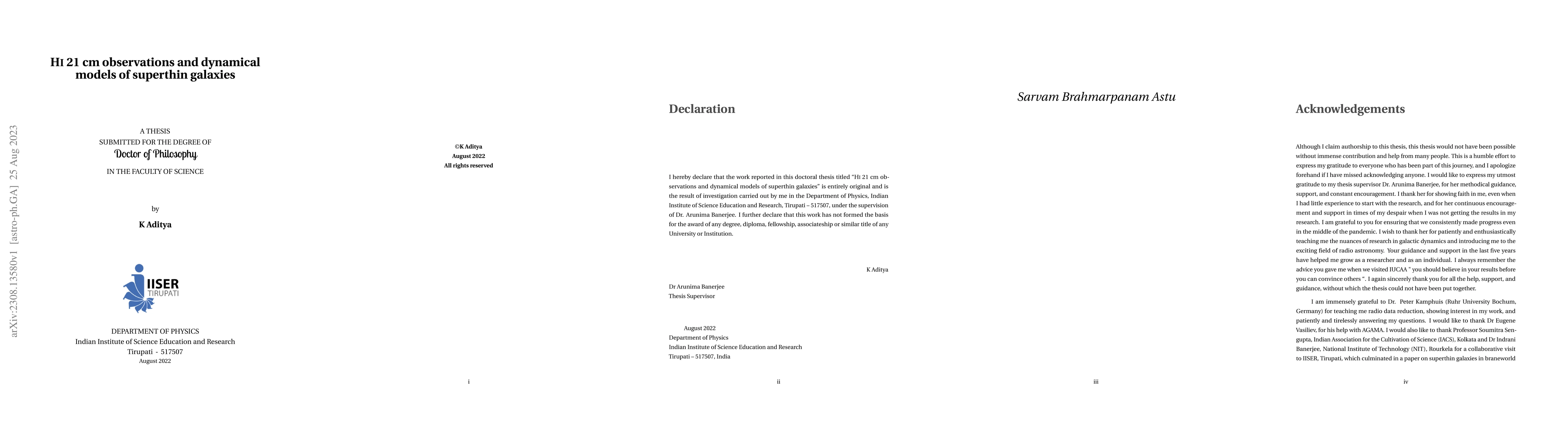The primary objective of this thesis is to identify the key dynamical mechanisms responsible for the superthin stellar discs. We use HI 21cm radio-synthesis observations and stellar photometry to construct detailed dynamical models of a sample of superthin galaxies to determine the primary mechanism responsible for the existence of superthin stellar discs in these galaxies. Our study is based on a sample of superthin galaxies with $\rm 10< a/b < 16$ for which H1 21cm radio-synthesis data were already available in the literature. In addition, we had the two thinnest galaxies in our sample with $\rm a/b \sim 21$, for which we carried out Giant Meterwave Radio Telescope (GMRT) 21cm radio-synthesis observations. To identify the physical mechanism primarily responsible for the superthin vertical structure, we carry out a Principal Component Analysis of the following dynamical parameters: 1) Dark matter dominance at inner galactocentric radii given by $V_{\rm{rot}}/{(R_{c}/R_{d})}$, 2) the ratio of the vertical-to-radial stellar velocity dispersion $(\sigma_{z,s}/\sigma_{R,s})$, 3) Disc dynamical stability against local axisymmetric perturbations $Q_{RW}$, 4) Specific angular momentum of the disc $(j_{*})$, along with $a/b$ for all superthins and the extremely thin galaxies. We note that the first two principal components explain $\sim$ 80$\%$ of the variation in the data, and the major contributions are from $a/b$, $Q_{RW}$ and $V_{\rm{rot}}/{(R_{c}/R_{d})}$. This possibly indicates that high values of the disc dynamical stability and dark matter dominance at inner galactocentric radii are fundamentally responsible for the superthin stellar discs.