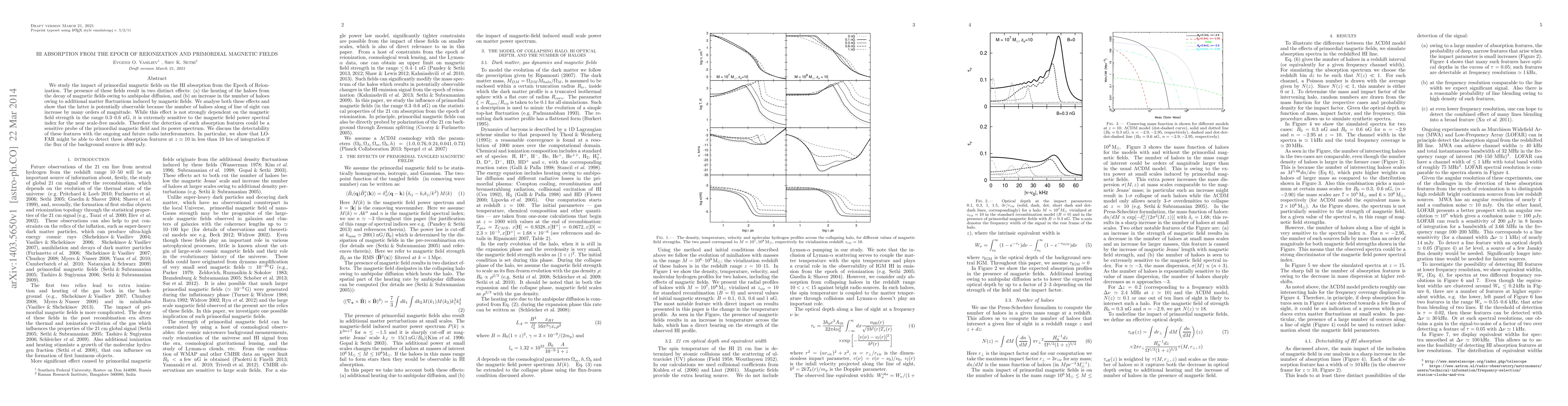 The paper presents a detailed analysis of how primordial magnetic fields affect HI absorption from collapsing haloes during the Epoch of Reionization, including the calculation of optical depth and halo number as functions of magnetic field strength and power spectral index.