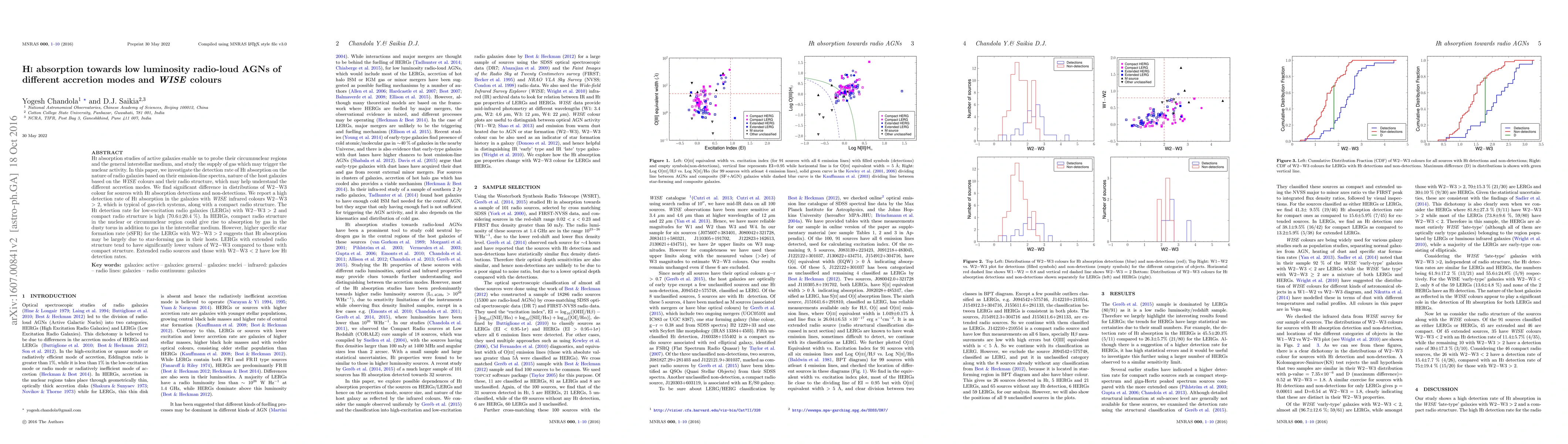 H{\sc i} absorption studies of active galaxies enable us to probe their circumnuclear regions and the general interstellar medium, and study the supply of gas which may trigger the nuclear activity. In this paper, we investigate the detection rate of H{\sc i} absorption on the nature of radio galaxies based on their emission-line spectra, nature of the host galaxies based on the \textit{WISE} colours and their radio structure, which may help understand the different accretion modes. We find significant difference in distributions of W2$-$W3 colour for sources with H{\sc i} absorption detections and non-detections. We report a high detection rate of H{\sc i} absorption in the galaxies with \textit{WISE} infrared colours W2$-$W3 $>$ 2, which is typical of gas-rich systems, along with a compact radio structure. The H{\sc i} detection rate for low-excitation radio galaxies (LERGs) with W2$-$W3 $>$ 2 and compact radio structure is high (70.6$\pm$20.4 \%). In HERGs, compact radio structure in the nuclear or circumnuclear region could give rise to absorption by gas in the dusty torus in addition to gas in the interstellar medium. However, higher specific star formation rate (sSFR) for the LERGs with W2$-$W3 $>$ 2 suggests that H{\sc i} absorption may be largely due to star-forming gas in their hosts. LERGs with extended radio structure tend to have significantly lower values of W2$-$W3 compared to those with compact structure. Extended radio sources and those with W2$-$W3 $<$ 2 have low H{\sc i} detection rates.