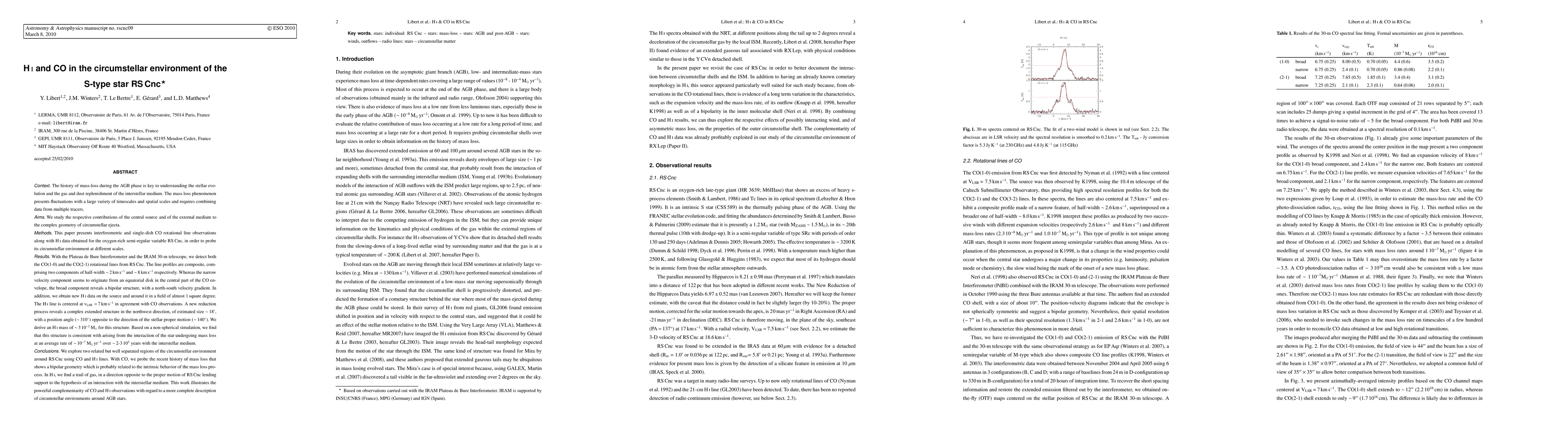 This paper presents interferometric and single-dish CO observations along with HI data obtained for the oxygen-rich semi-regular variable RS Cnc, in order to probe its circumstellar environment at different scales. With the Plateau de Bure Interferometer and the IRAM 30-m telescope, we detect both the CO(1-0) and the CO(2-1) rotational lines from RS Cnc. The line profiles are composite, with two components of half-width ~2 km/s and ~8 km/s respectively. Whereas the narrow velocity component seems to originate from an equatorial disk in the central part of the CO envelope, the broad component reveals a bipolar structure, with a north-south velocity gradient. In addition, we obtain new HI data on the source and around it in a field of almost 1 square degree. The HI line is centered at v_LSR = 7 km/s in agreement with CO observations. A new reduction process reveals a complex extended structure in the northwest direction, of estimated size ~18 arcmin, with a PA (~310 degrees) opposite to the direction of the stellar proper motion (~140 degrees). We derive an HI mass of ~3 10^-2 M_sun for this structure. Based on a non-spherical simulation, we find that this structure is consistent with arising from the interaction of the star undergoing mass loss at an average rate of ~10^-7 M_sun.yr^-1 over ~2-3 10^5 years with the interstellar medium. This work illustrates the powerful complementarity of CO and HI observations with regard to a more complete description of circumstellar environments around AGB stars.
