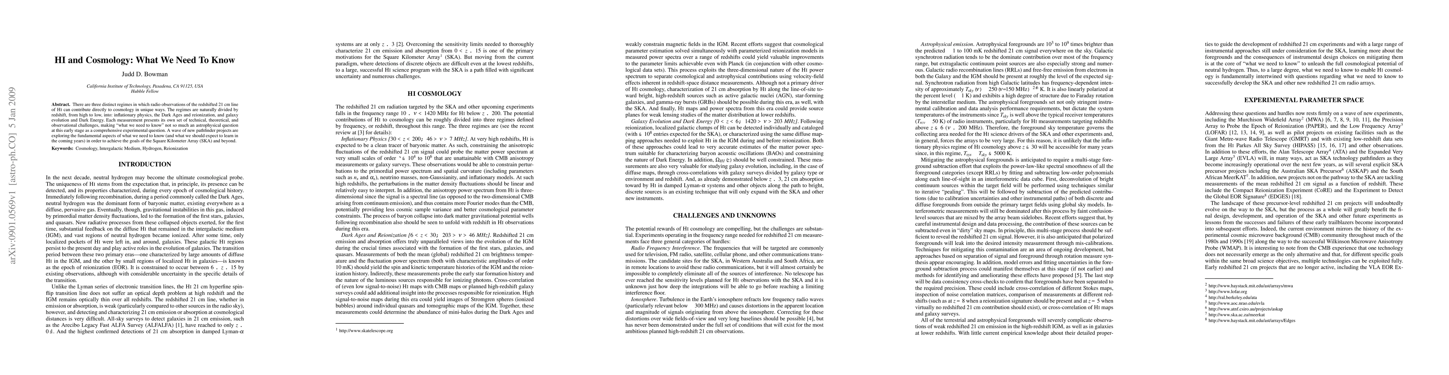 There are three distinct regimes in which radio observations of the redshifted 21 cm line of HI can contribute directly to cosmology in unique ways. The regimes are naturally divided by redshift, from high to low, into: inflationary physics, the Dark Ages and reionization, and galaxy evolution and Dark Energy. Each measurement presents its own set of technical, theoretical, and observational challenges, making "what we need to know" not so much an astrophysical question at this early stage as a comprehensive experimental question. A wave of new pathfinder projects are exploring the fundamental aspects of what we need to know (and what we should expect to learn in the coming years) in order to achieve the goals of the Square Kilometer Array (SKA) and beyond.