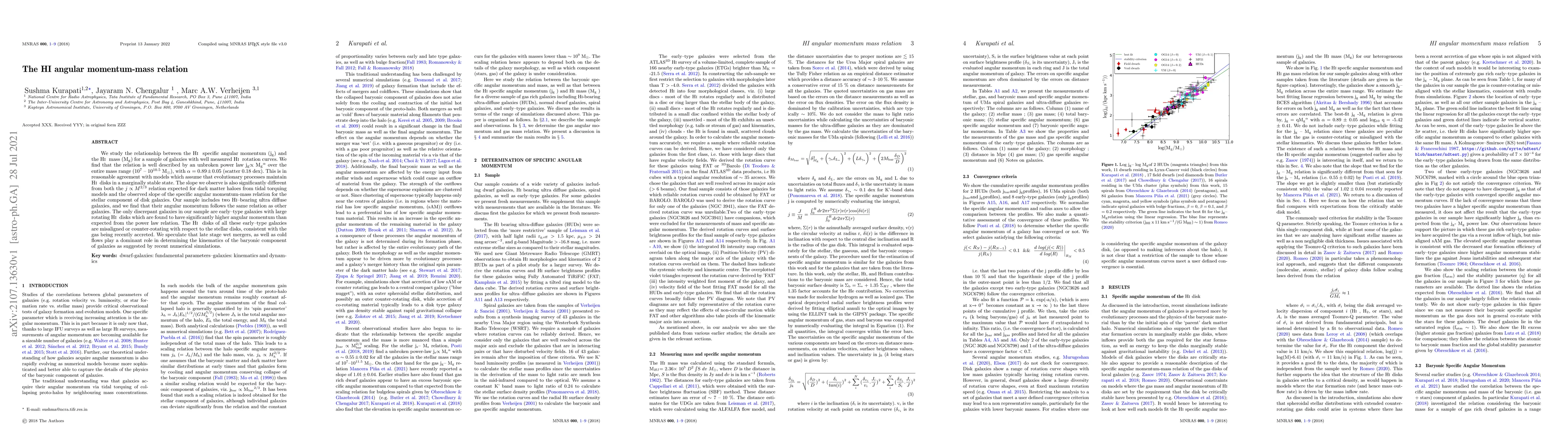 We study the relationship between the H{\sc i} specific angular momentum (j$_{\rm g}$) and the H{\sc i} mass (M$_{\rm g}$) for a sample of galaxies with well measured H{\sc i} rotation curves. We find that the relation is well described by an unbroken power law \jg $\propto$ \mg$^{\alpha}$ over the entire mass range (10$^{7}$-10$^{10.5}$ M$_{\odot}$), with $\alpha = 0.89 \pm 0.05$ (scatter 0.18 dex). This is in reasonable agreement with models which assume that evolutionary processes maintain H{\sc i} disks in a marginally stable state. The slope we observe is also significantly different from both the $j \propto M^{2/3}$ relation expected for dark matter haloes from tidal torquing models and the observed slope of the specific angular momentum-mass relation for the stellar component of disk galaxies. Our sample includes two H{\sc i}-bearing ultra diffuse galaxies, and we find that their angular momentum follows the same relation as other galaxies. The only discrepant galaxies in our sample are early-type galaxies with large rotating H{\sc i} disks which are found to have significantly higher angular momentum than expected from the power law relation. The H{\sc i} disks of all these early-type galaxies are misaligned or counter-rotating with respect to the stellar disks, consistent with the gas being recently accreted. We speculate that late stage wet mergers, as well as cold flows play a dominant role in determining the kinematics of the baryonic component of galaxies as suggested by recent numerical simulations.