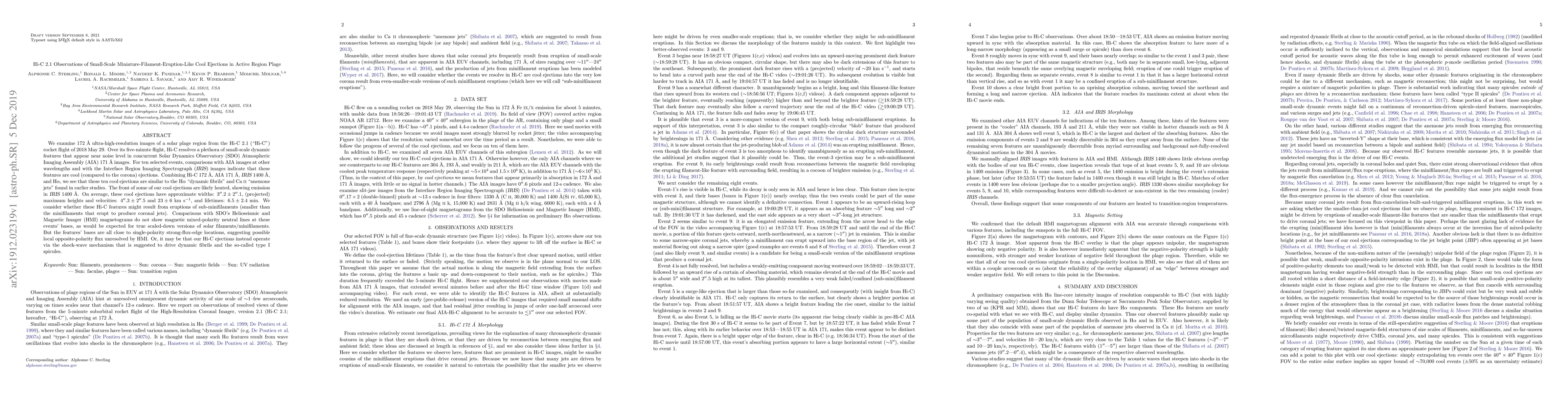 We examine 172 Ang ultra-high-resolution images of a solar plage region from the Hi-C 2.1 ("Hi-C") rocket flight of 2018 May 29. Over its five-minute flight, Hi-C resolves a plethora of small-scale dynamic features that appear near noise level in concurrent Solar Dynamics Observatory (SDO) Atmospheric Imaging Assembly (AIA) 171 Ang images. For ten selected events, comparisons with AIA images at other wavelengths and with the Interface Region Imaging Spectrograph (IRIS) images indicate that these features are cool (compared to the corona) ejections. Combining Hi-C 172 Ang, AIA 171 Ang, IRIS 1400 Ang, and H$\alpha$, we see that these ten cool ejections are similar to the H$\alpha$ "dynamic fibrils" and Ca ii "anemone jets" found in earlier studies. The front of some of our cool ejections are likely heated, showing emission in IRIS 1400 Ang. On average, these cool ejections have approximate widths: $3''.2 \pm 2''.1$, (projected) maximum heights and velocities: $4''.3 \pm 2''.5$ and $23 \pm 6$ km/s, and lifetimes: $6.5 \pm 2.4$ min. We consider whether these Hi-C features might result from eruptions of sub-minifilaments (smaller than the minifilaments that erupt to produce coronal jets). Comparisons with SDO's Helioseismic and Magnetic Imager (HMI) magnetograms do not show magnetic mixed-polarity neutral lines at these events' bases, as would be expected for true scaled-down versions of solar filaments/minifilaments. But the features' bases are all close to single-polarity strong-flux-edge locations, suggesting possible local opposite-polarity flux unresolved by HMI. Or, it may be that our Hi-C ejections instead operate via the shock-wave mechanism that is suggested to drive dynamic fibrils and the so-called type I spicules.