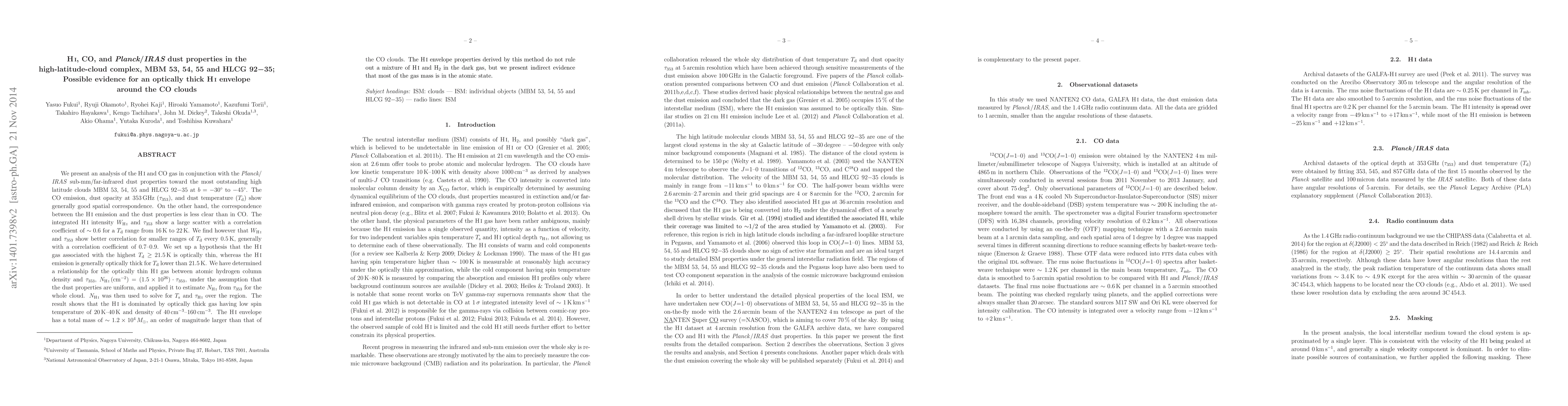 This paper analyzes HI and CO gas alongside Planck/IRAS dust properties in high-latitude clouds MBM 53, 54, 55, and HLCG 92-35, finding that HI gas forms an optically thick envelope around CO clouds. The study suggests that HI gas is predominantly optically thick at lower dust temperatures, with an estimated total HI envelope mass of ~1.2 x 10^4 Msol, significantly larger than the CO clouds.
