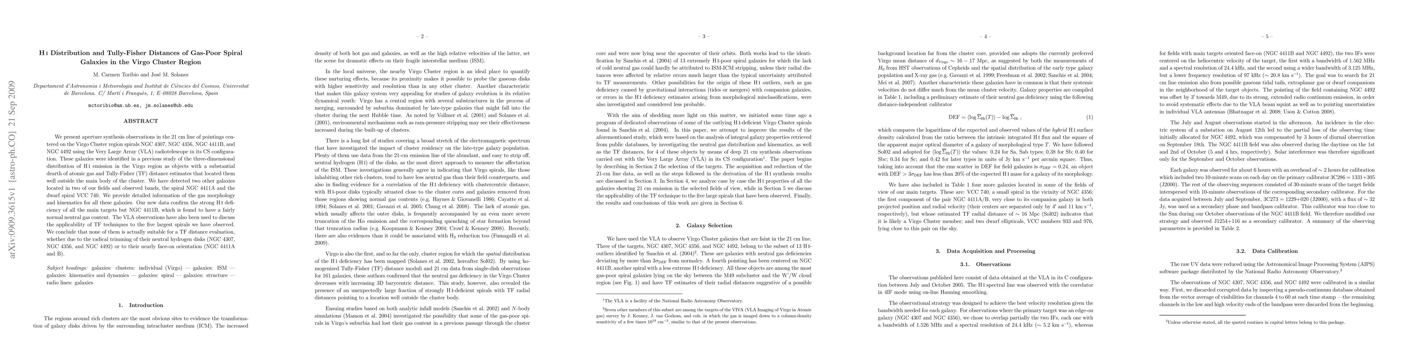 This study uses VLA radiotelescope observations to analyze the HI distribution and Tully-Fisher distances in gas-poor spiral galaxies in the Virgo Cluster, confirming the HI deficiency in most galaxies and questioning the applicability of Tully-Fisher techniques for distance evaluation due to their gas morphology and orientations.