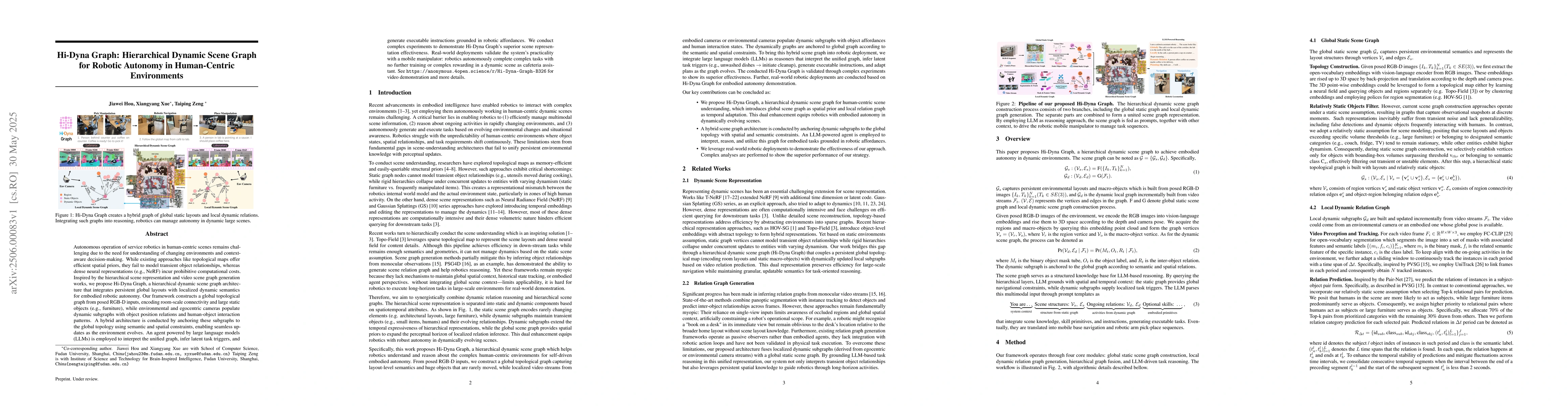 The paper proposes Hi-Dyna Graph, a hierarchical dynamic scene graph architecture for robotic autonomy in human-centric environments, integrating persistent global layouts with localized dynamic semantics using RGB-D inputs and environmental cameras.