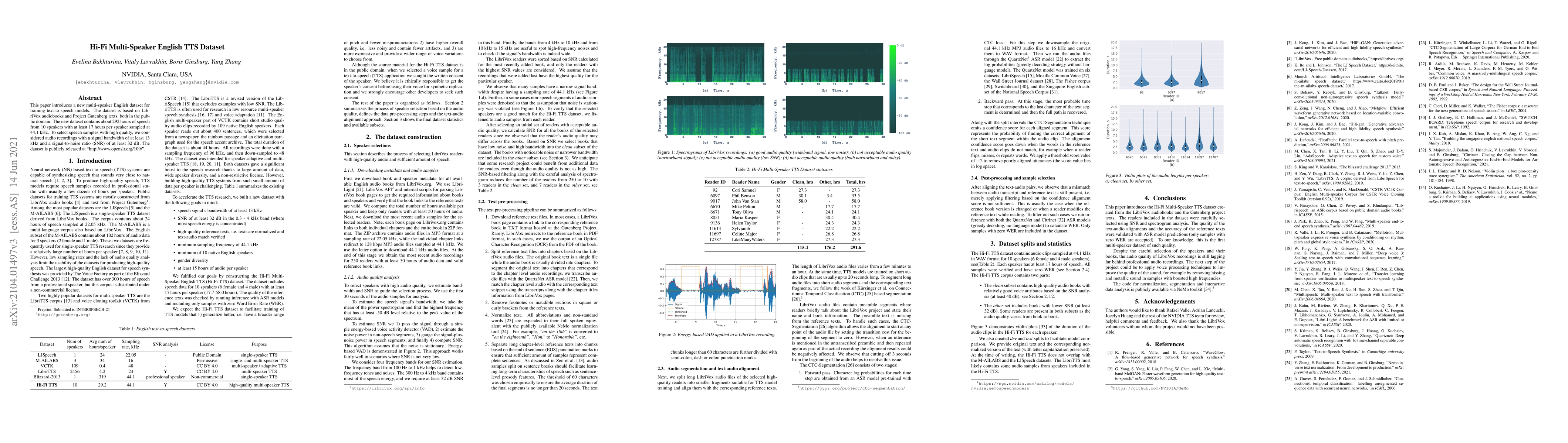 This paper introduces a new multi-speaker English dataset for training text-to-speech models. The dataset is based on LibriVox audiobooks and Project Gutenberg texts, both in the public domain. The new dataset contains about 292 hours of speech from 10 speakers with at least 17 hours per speaker sampled at 44.1 kHz. To select speech samples with high quality, we considered audio recordings with a signal bandwidth of at least 13 kHz and a signal-to-noise ratio (SNR) of at least 32 dB. The dataset is publicly released at http://www.openslr.org/109/ .