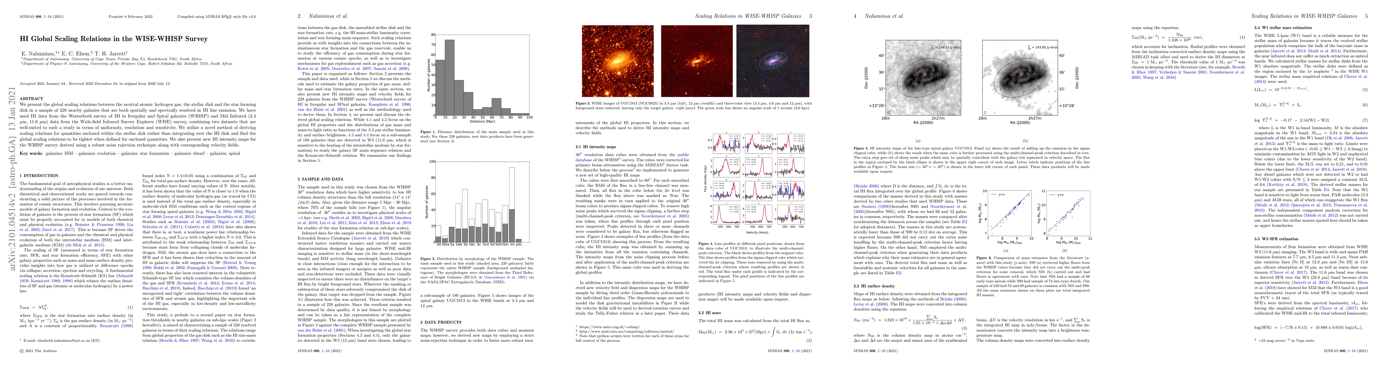 This paper investigates global scaling relations between neutral atomic hydrogen gas, stellar disk, and star-forming regions in 228 nearby galaxies using WHISP HI data and WISE mid-infrared data. The study finds tighter scaling relations when considering quantities enclosed within the stellar disk rather than the entire HI disk.