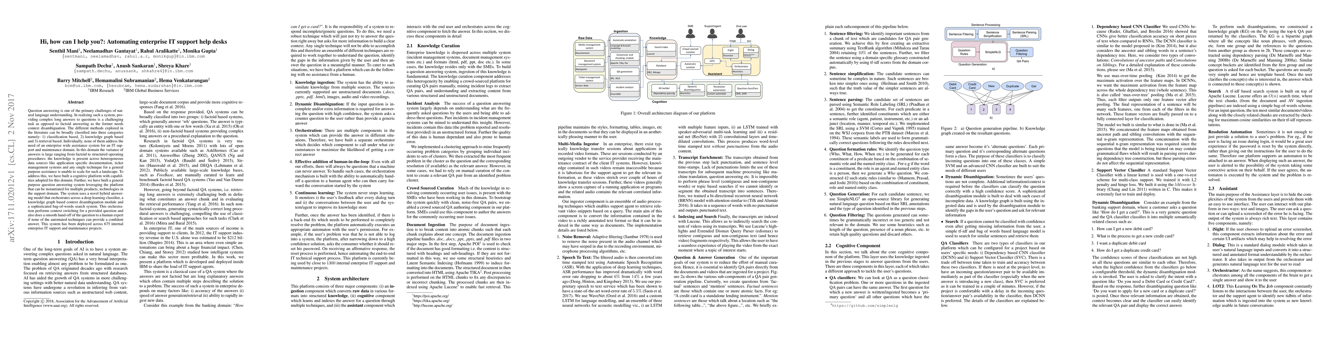 Question answering is one of the primary challenges of natural language understanding. In realizing such a system, providing complex long answers to questions is a challenging task as opposed to factoid answering as the former needs context disambiguation. The different methods explored in the literature can be broadly classified into three categories namely: 1) classification based, 2) knowledge graph based and 3) retrieval based. Individually, none of them address the need of an enterprise wide assistance system for an IT support and maintenance domain. In this domain the variance of answers is large ranging from factoid to structured operating procedures; the knowledge is present across heterogeneous data sources like application specific documentation, ticket management systems and any single technique for a general purpose assistance is unable to scale for such a landscape. To address this, we have built a cognitive platform with capabilities adopted for this domain. Further, we have built a general purpose question answering system leveraging the platform that can be instantiated for multiple products, technologies in the support domain. The system uses a novel hybrid answering model that orchestrates across a deep learning classifier, a knowledge graph based context disambiguation module and a sophisticated bag-of-words search system. This orchestration performs context switching for a provided question and also does a smooth hand-off of the question to a human expert if none of the automated techniques can provide a confident answer. This system has been deployed across 675 internal enterprise IT support and maintenance projects.
