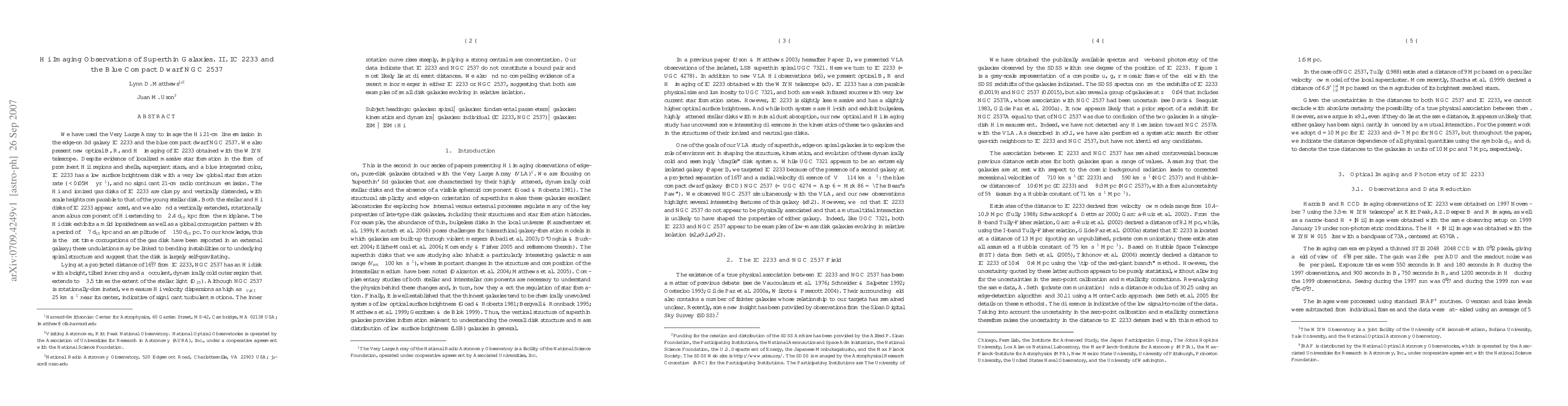 We have used the VLA to image the HI 21-cm line emission in the edge-on Sd galaxy IC2233 and the blue compact dwarf NGC2537. We also present new optical B,R, and H alpha imaging of IC2233 obtained with the WIYN telescope. Despite evidence of localized massive star formation, IC2233 has a low surface brightness disk with a low global star formation rate (~0.05 M_sun/yr), and no significant 21-cm radio continuum emission. The HI and ionized gas disks of IC2233 are clumpy and vertically distended, with scale heights comparable to the young stars. Both the stellar and HI disks of IC2233 appear flared, and we also find a vertically extended, rotationally anomalous HI component extending to z~2.4 kpc. The HI disk exhibits a mild lopsidedness as well as a global corrugation pattern with a period of ~7 kpc and an amplitude of ~150 pc. To our knowledge, this is the first time corrugations of the gas disk have been reported in an external galaxy; these undulations may be linked to bending instabilities or to underlying spiral structure and suggest that the disk is largely self-gravitating. Lying at a projected distance of 16.7' from IC2233, NGC2537 has an HI disk with a bright, tilted inner ring and a flocculent, dynamically cold outer region that extends to ~3.5D_25. Although NGC2537 is rotationally-dominated, it shows significant turbulence near its center. The inner rotation curve rises steeply, implying a strong central mass concentration. Our data indicate that IC2233 and NGC2537 do not constitute a bound pair and most likely lie at different distances. We also find no compelling evidence of a recent minor merger in either galaxy, suggesting that both are examples of small disk galaxies evolving in relative isolation. (Abridged)