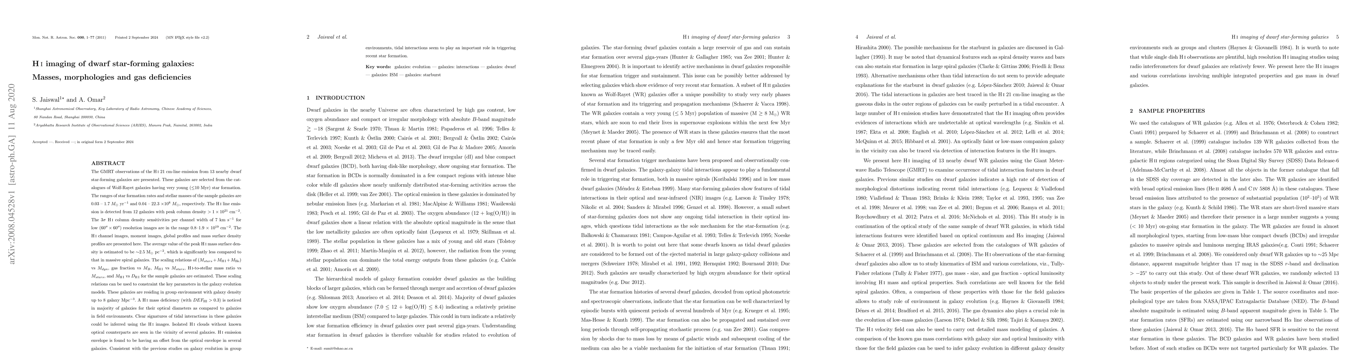 The GMRT observations of the HI 21~cm-line emission from 13~nearby dwarf star-forming galaxies are presented. The ranges of star formation rates and stellar masses of the sample galaxies are 0.03 -- 1.7~$M_\odot~{\rm yr}^{-1}$ and 0.04 -- 22.3~$\times 10^8~M_\odot$, respectively. The HI channel images, moment images, global profiles and mass surface density profiles are presented here. The average value of the peak HI mass surface density is estimated to be $\sim$2.5~M$_{\odot}$~pc$^{-2}$, which is significantly less compared to that in massive spiral galaxies. The scaling relations of $(M_{stars} + M_{\rm H\,I} + M_{\rm He})$ vs $M_{dyn}$, gas fraction vs $M_B$, $M_{\rm H\,I}$ vs $M_{stars}$, \ion{H}{i}-to-stellar mass ratio vs $M_{stars}$, and $M_{\rm H\,I}$ vs $D_{\rm H\,I}$ for the sample galaxies are estimated. These scaling relations can be used to constraint the key parameters in the galaxy evolution models. These galaxies are residing in group environment with galaxy density up to 8~galaxy~Mpc$^{-3}$. A HI mass deficiency (with $DEF_{\rm HI} > 0.3$) is noticed in majority of galaxies for their optical diameters as compared to galaxies in field environments. Clear signatures of tidal interactions in these galaxies could be inferred using the HI images. Isolated HI clouds without known optical counterparts are seen in the vicinity of several galaxies. HI emission envelope is found to be having an offset from the optical envelope in several galaxies. Consistent with the previous studies on galaxy evolution in group environments, tidal interactions seem to play an important role in triggering recent star formation.