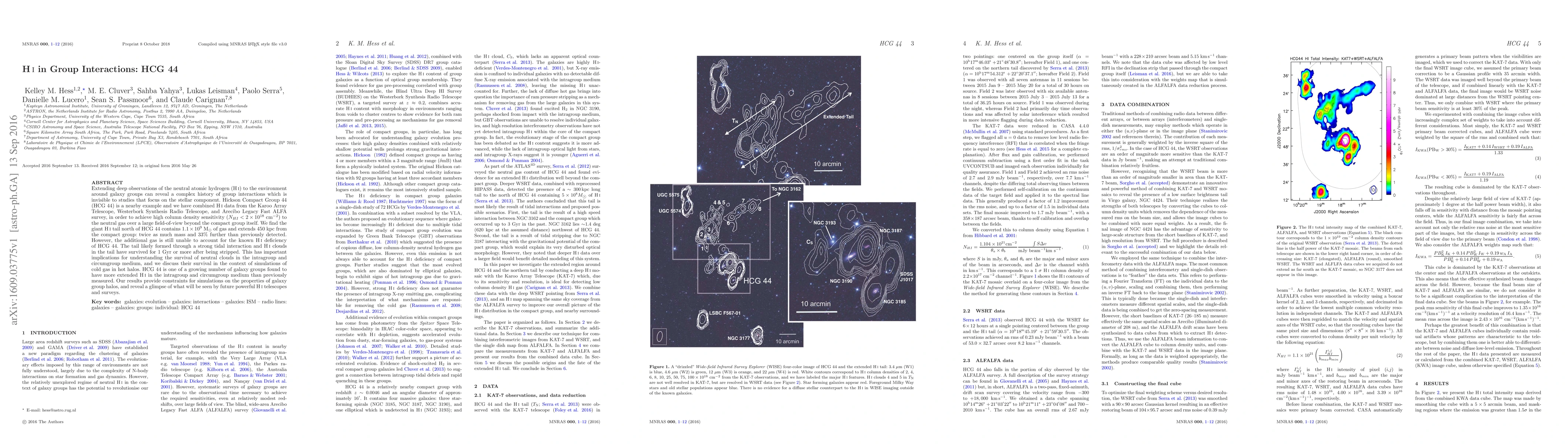 The study combined deep HI observations from the Karoo Array Telescope, Westerbork Synthesis Radio Telescope, and Arecibo Legacy Fast ALFA survey to map the neutral atomic hydrogen (HI) gas in the environment around Hickson Compact Group 44 (HCG 44), revealing a giant HI tail extending 450 kpc from the group.