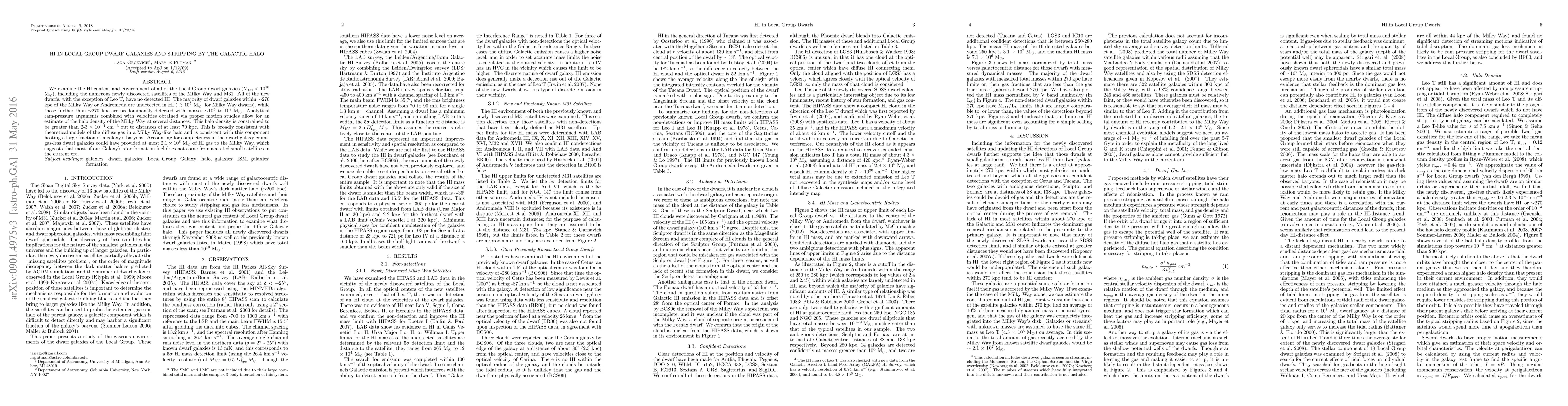 This paper investigates the HI content of Local Group dwarf galaxies, finding that most within ~270 kpc of the Milky Way lack detectable HI, likely due to stripping by the galactic halo. The study estimates the Milky Way's halo density and suggests that accreted dwarf galaxies contribute minimally to the Milky Way's current star formation fuel.