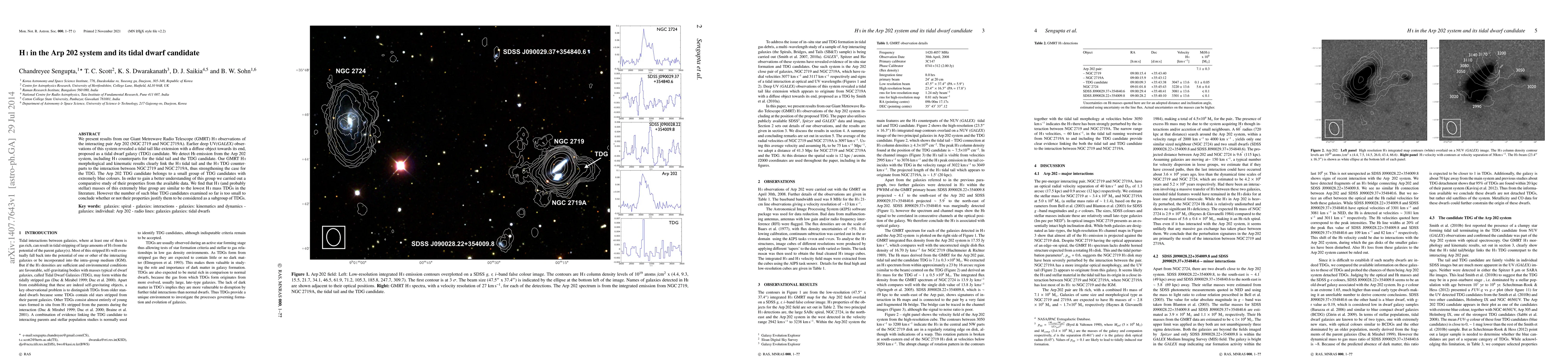 This study uses GMRT HI observations to investigate the Arp 202 system, confirming HI counterparts for a tidal tail and a tidal dwarf galaxy (TDG) candidate, thus supporting the TDG hypothesis. The extremely blue TDG candidate is part of a small group with similar HI masses, but insufficient data exists to determine if they form a distinct subgroup.
