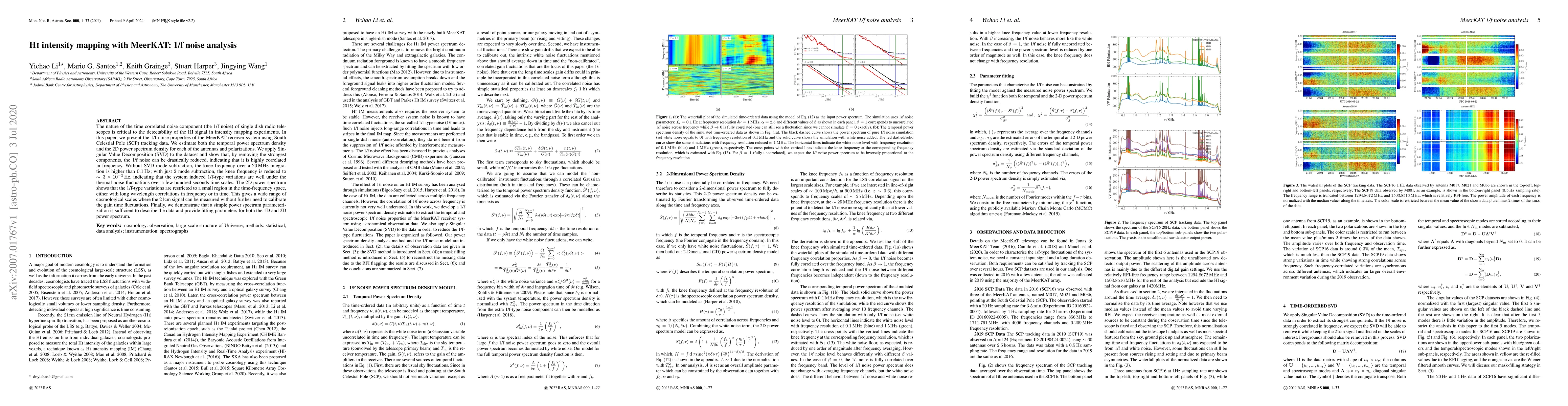 This paper analyzes the 1/f noise in the MeerKAT radio telescope's receiver system using SCP tracking data, finding that Singular Value Decomposition (SVD) can significantly reduce correlated 1/f noise. With SVD, the knee frequency of the 1/f noise is reduced to below $3\times10^{-3}$ Hz, allowing for cosmological 21cm signal measurements over a wide range without gain time fluctuations calibration.