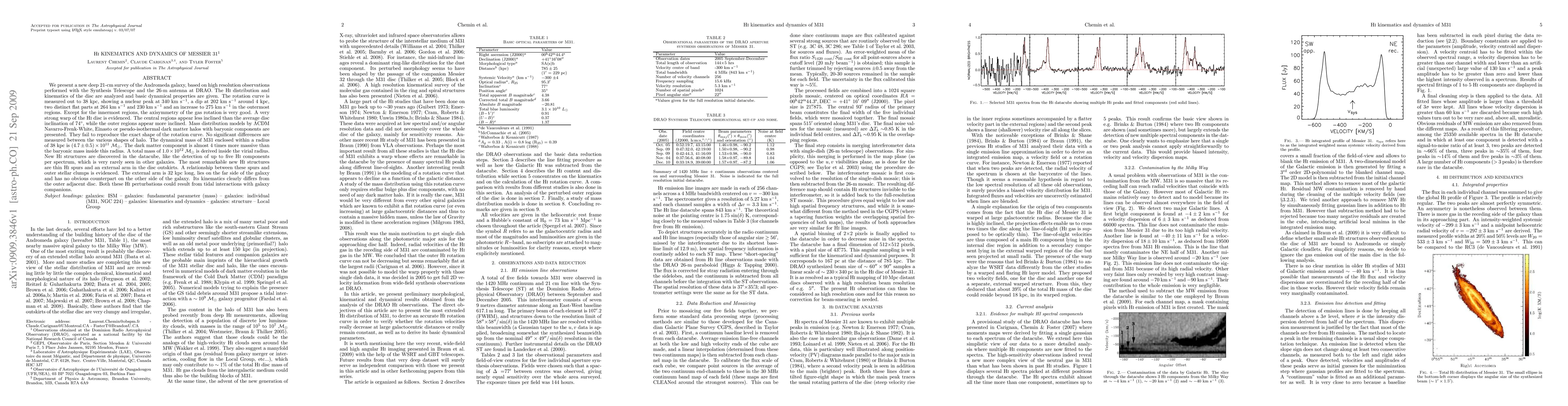 [Abridged] We present a new deep 21-cm survey of the Andromeda galaxy, based on high resolution observations performed with the Synthesis Telescope and the 26-m antenna at DRAO. The HI distribution and kinematics of the disc are analyzed and basic dynamical properties are given. The rotation curve is measured out to 38 kpc, showing a nuclear peak, a dip around 4 kpc, two distinct flat parts and an increase in the outermost regions. Except for the innermost regions, the axisymmetry of the gas rotation is very good. A very strong warp of the HI disc is evidenced. The central regions appear less inclined than the average disc inclination, while the outer regions appear more inclined. Mass distribution models by LCDM NFW, Einasto or pseudo-isothermal dark matter halos with baryonic components are presented. They fail to reproduce the exact shape of the rotation curve. No significant differences are measured between the various shapes of halo. The dynamical mass of M31 enclosed within a radius of 38 kpc is (4.7 +/- 0.5) x 10^11 Msol. The dark matter component is almost 4 times more massive than the baryonic mass inside this radius. A total mass of 1.0 x 10^12 Msol is derived inside the virial radius. New HI structures are discovered in the datacube, like the detection of up to five HI components per spectrum, which is very rarely seen in other galaxies. The most remarkable new HI structures are thin HI spurs and an external arm in the disc outskirts. A relationship between these spurs and outer stellar clumps is evidenced. The external arm is 32 kpc long, lies on the far side of the galaxy and has no obvious counterpart on the other side of the galaxy. Its kinematics clearly differs from the outer adjacent disc. Both these HI perturbations could result from tidal interactions with galaxy companions.