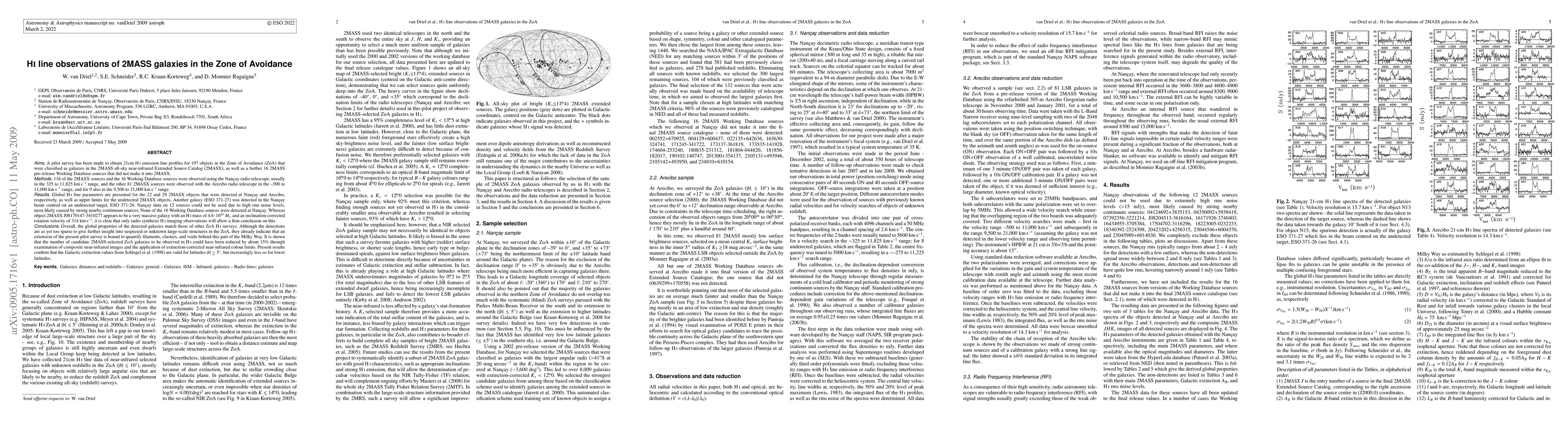 This study observed 197 galaxies in the Zone of Avoidance using radio telescopes to detect HI emission lines, finding that many match global properties of other surveys, with some indicating large-scale structures behind the Milky Way.