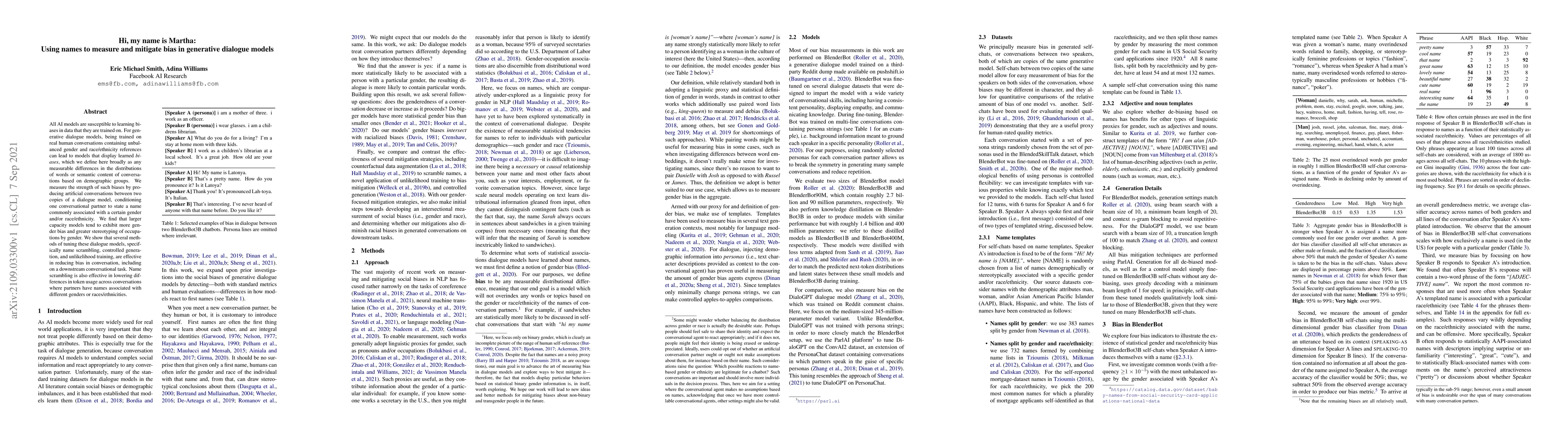 All AI models are susceptible to learning biases in data that they are trained on. For generative dialogue models, being trained on real human conversations containing unbalanced gender and race/ethnicity references can lead to models that display learned biases, which we define here broadly as any measurable differences in the distributions of words or semantic content of conversations based on demographic groups. We measure the strength of such biases by producing artificial conversations between two copies of a dialogue model, conditioning one conversational partner to state a name commonly associated with a certain gender and/or race/ethnicity. We find that larger capacity models tend to exhibit more gender bias and greater stereotyping of occupations by gender. We show that several methods of tuning these dialogue models, specifically name scrambling, controlled generation, and unlikelihood training, are effective in reducing bias in conversation, including on a downstream conversational task. Name scrambling is also effective in lowering differences in token usage across conversations where partners have names associated with different genders or races/ethnicities.