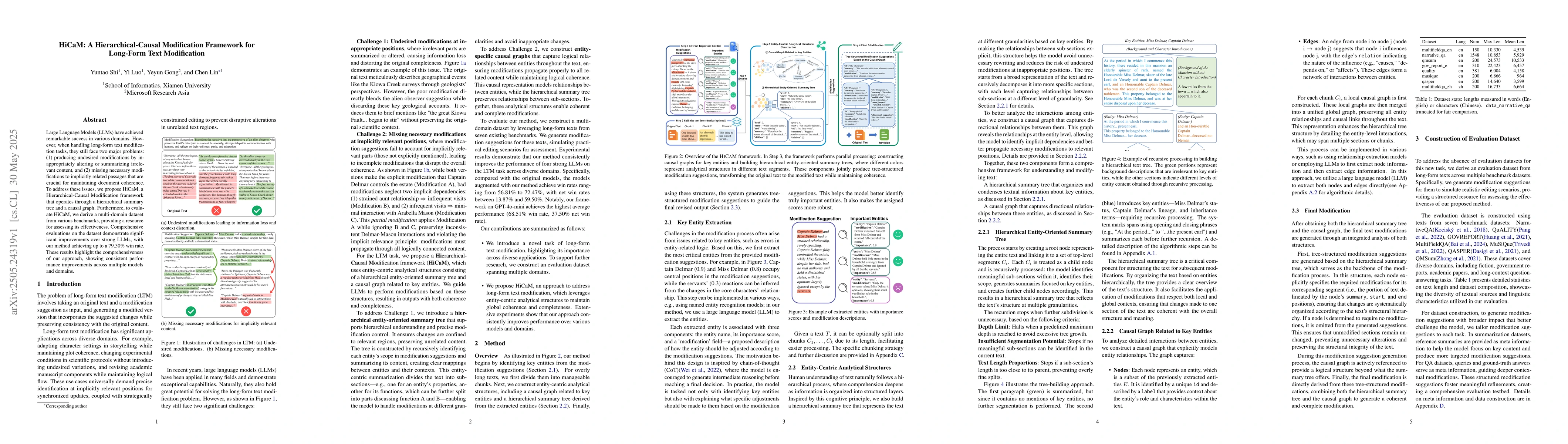HiCaM introduces a hierarchical-causal modification framework utilizing summary trees and causal graphs to improve long-form text modification tasks in LLMs.