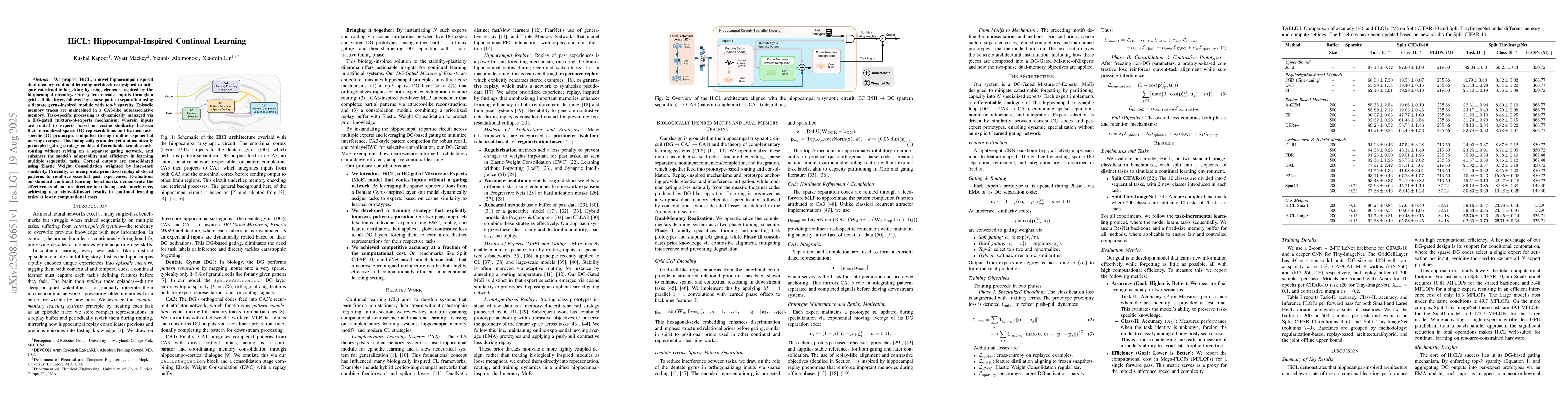 We propose HiCL, a novel hippocampal-inspired dual-memory continual learning architecture designed to mitigate catastrophic forgetting by using elements inspired by the hippocampal circuitry. Our system encodes inputs through a grid-cell-like layer, followed by sparse pattern separation using a dentate gyrus-inspired module with top-k sparsity. Episodic memory traces are maintained in a CA3-like autoassociative memory. Task-specific processing is dynamically managed via a DG-gated mixture-of-experts mechanism, wherein inputs are routed to experts based on cosine similarity between their normalized sparse DG representations and learned task-specific DG prototypes computed through online exponential moving averages. This biologically grounded yet mathematically principled gating strategy enables differentiable, scalable task-routing without relying on a separate gating network, and enhances the model's adaptability and efficiency in learning multiple sequential tasks. Cortical outputs are consolidated using Elastic Weight Consolidation weighted by inter-task similarity. Crucially, we incorporate prioritized replay of stored patterns to reinforce essential past experiences. Evaluations on standard continual learning benchmarks demonstrate the effectiveness of our architecture in reducing task interference, achieving near state-of-the-art results in continual learning tasks at lower computational costs.